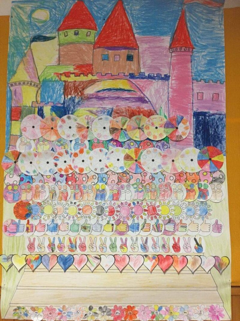 Az utolsó Boldogságórát az emlékek felidézésével töltöttük. A foglakozásokon készült fotókból kiválasztottam néhányat és azokon keresztül elevenítettük fel az elmúlt boldogságórák történéseit. Ahogy egy témát átbeszéltünk, utána meghallgattuk a hónap dalát, melyre táncra is kerekedtünk. Így nézegettük végig a képeket és minden gyerek megjegyezte, hogy melyik foglalkozás tetszett neki a legjobban. A jeleket még nem jegyezték meg, hogy melyik tevékenységhez kapcsolódik, ezért az összeset kiszínezték, amit aztán felragasztottunk a Boldogságvárunk falára. Kitehetjük a várunk bejáratára a „MEGTELT!” táblát. A Boldogságórákon a gyerekekre jellemző volt a felszabadultság, az őszinteség, a nyíltság és az érzelmek megfogalmazása. Az arcukon mindig a mosoly, a jókedv tükröződött. Néhányszor a felszabadultság érzése túlment a megengedett határon, akkor mindig megerősítettem bennük azt a dolgot, hogy a jókedv és az öröm nem egyenlő a butáskodással és a bohóckodással. Figyeljék meg és tanulják meg, hogy a jó érzések különböznek a butáskodástól. Látszott az arckifejezésükön, hogy nagyon elgondolkodtatta őket ez a felismerés.