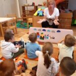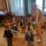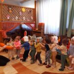 Foglalkozást kezdő éneklés: Ezután Bagdi Bella „Világomban minden rendben van” című albumát hallgattuk meg és együtt énekeltük. A dalhoz mozgássort is társítottunk: kört alkotva táncoltunk, egymás mozdulatait utánoztuk. A közös éneklés és mozgás során a gyerekek megtapasztalták az összetartozás örömét, a derű és harmónia érzését.