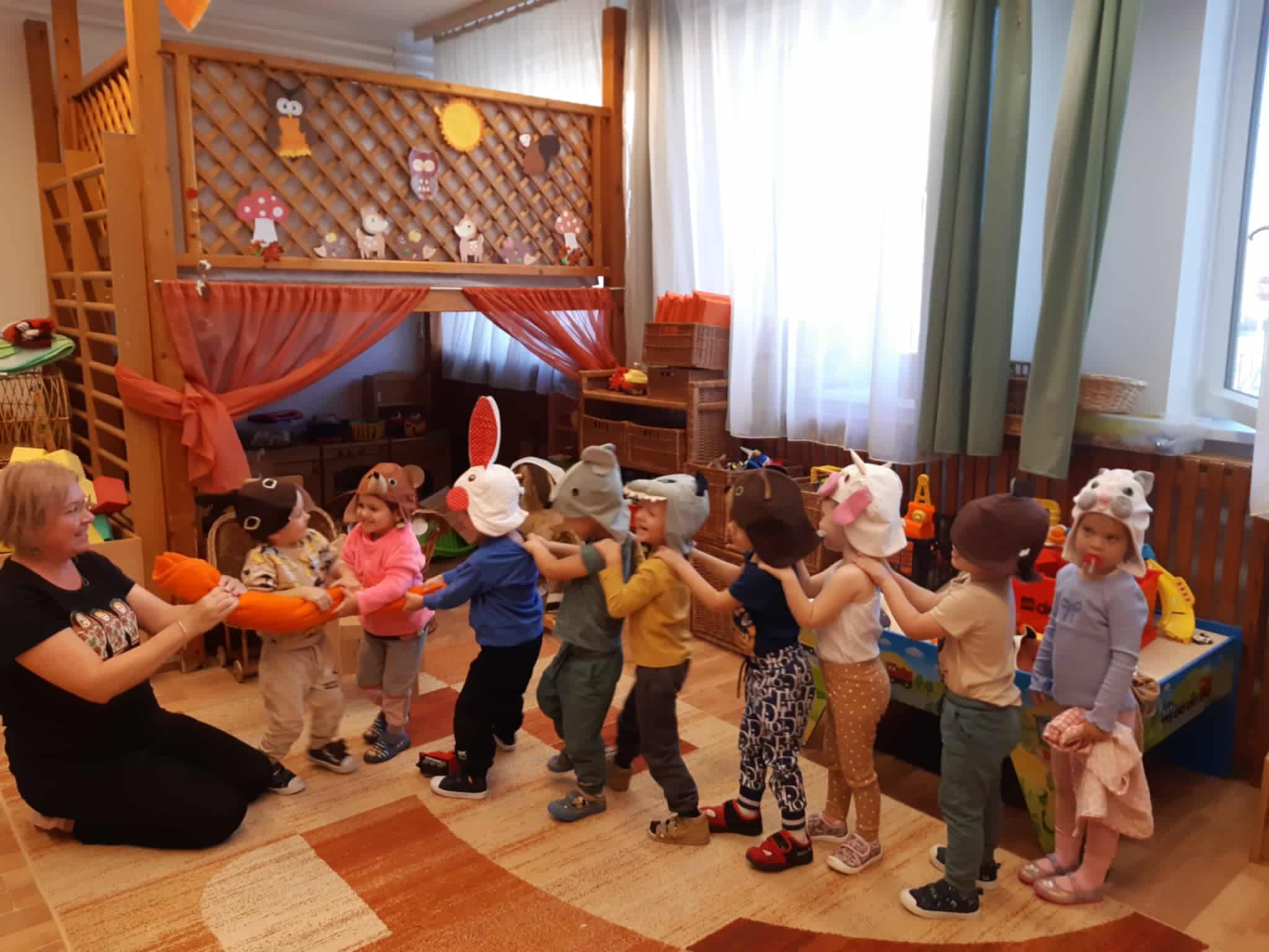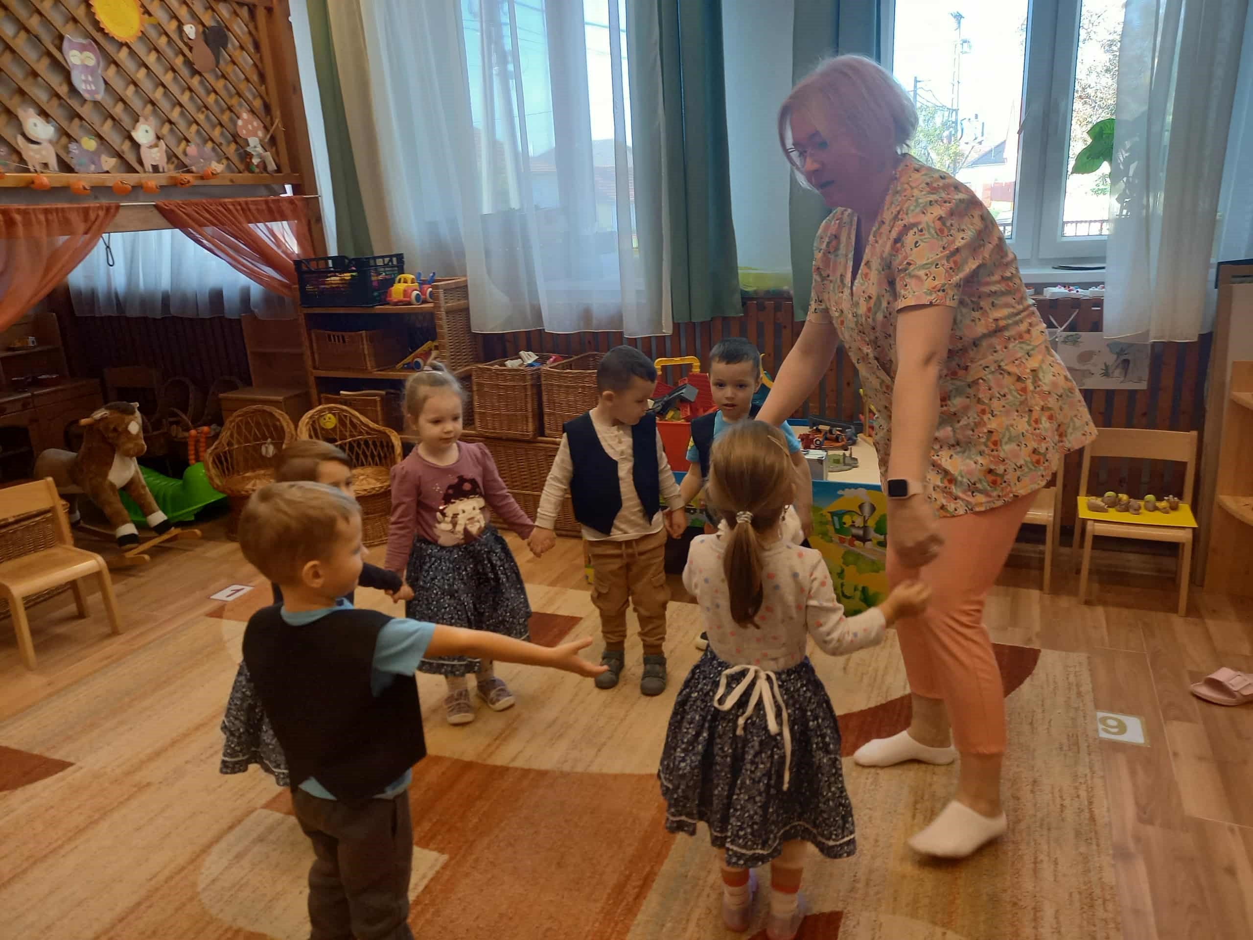 Foglalkozást kezdő éneklés: Ezután Bagdi Bella „Világomban minden rendben van” című albumát hallgattuk meg és együtt énekeltük. A dalhoz mozgássort is társítottunk: kört alkotva táncoltunk, egymás mozdulatait utánoztuk. A közös éneklés és mozgás során a gyerekek megtapasztalták az összetartozás örömét, a derű és harmónia érzését.