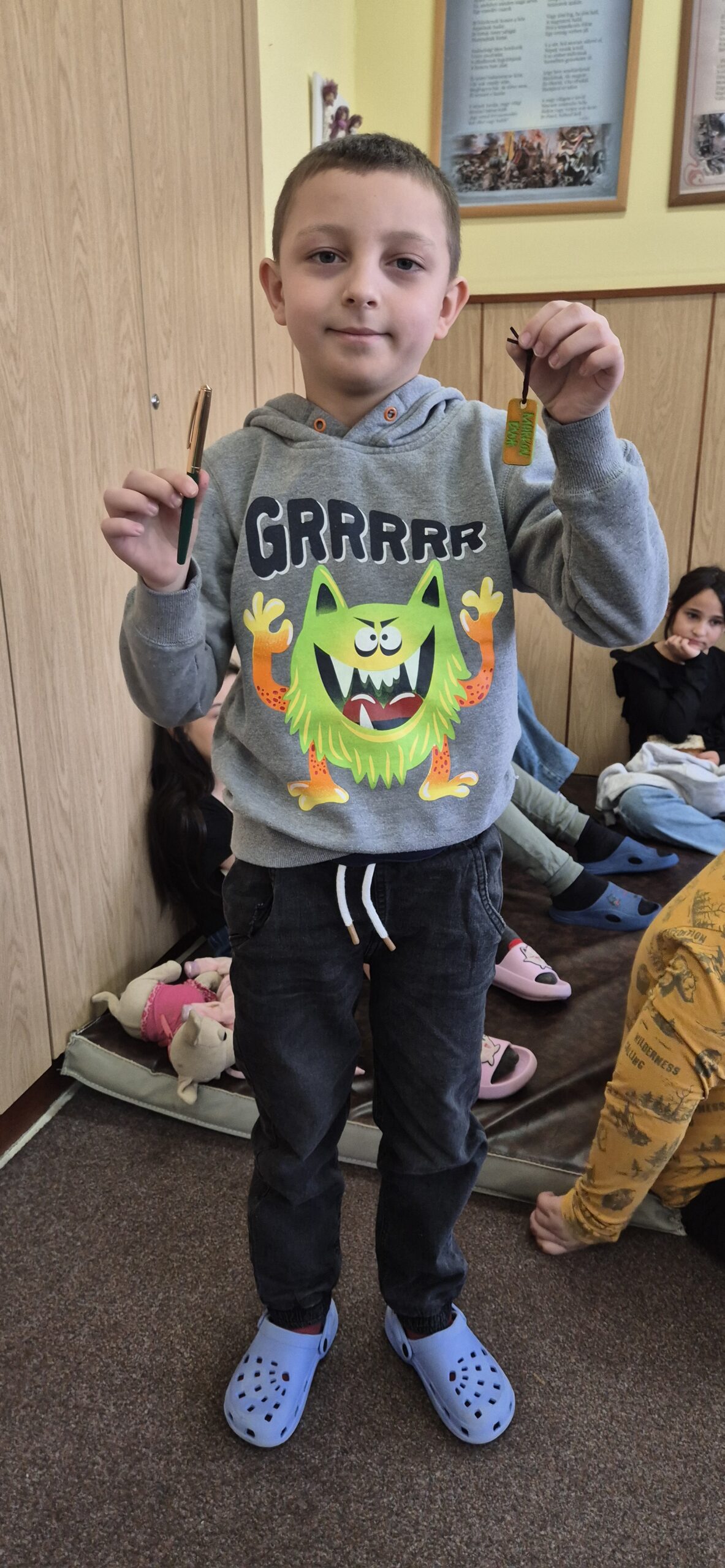 A vers felolvasása és megbeszélése után a gyerekek elővették a kincseket. Volt köztük első ajándék, nem működő egér, az első sulis tollam ami már nem ír, elszakadt nyaklánc, a simogatástól megkopott plüss, egy erdei séta alkalmával talált síp. Féltve őrzött ” kacatjaikat ” egy rövid történettel mutatták be.