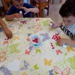Az e havi választható témakörök közül választottam a „Fonalszív” készítését. A gyerekek nagy türelemmel tekergették a fonalat, gyönyörű szívek készültek. A kisebbek szívecske formára kis, piros négyzetlapokat ragasztottak, ezzel töltötték ki a felületet. Nagy örömmel dolgoztak ők is. Az elkészült szívecskékből egy nagyon szép virágos képet készítettünk, amivel a fali újságunkat dekoráltuk.