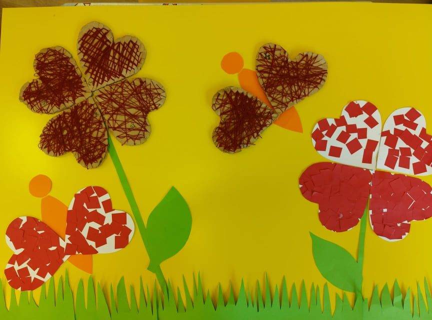 Az e havi választható témakörök közül választottam a „Fonalszív” készítését. A gyerekek nagy türelemmel tekergették a fonalat, gyönyörű szívek készültek. A kisebbek szívecske formára kis, piros négyzetlapokat ragasztottak, ezzel töltötték ki a felületet. Nagy örömmel dolgoztak ők is. Az elkészült szívecskékből egy nagyon szép virágos képet készítettünk, amivel a fali újságunkat dekoráltuk.