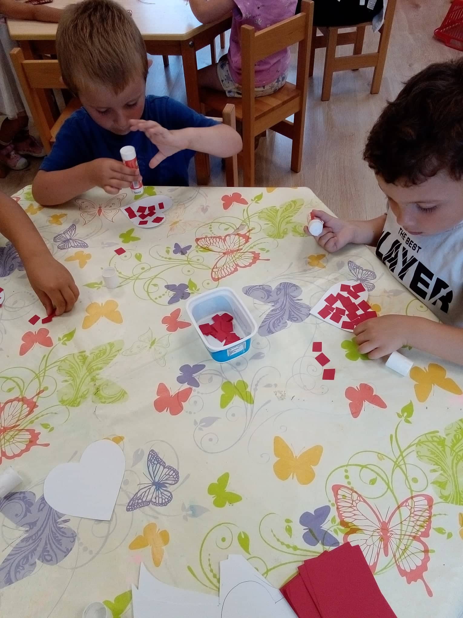 Az e havi választható témakörök közül választottam a „Fonalszív” készítését. A gyerekek nagy türelemmel tekergették a fonalat, gyönyörű szívek készültek. A kisebbek szívecske formára kis, piros négyzetlapokat ragasztottak, ezzel töltötték ki a felületet. Nagy örömmel dolgoztak ők is. Az elkészült szívecskékből egy nagyon szép virágos képet készítettünk, amivel a fali újságunkat dekoráltuk.