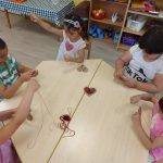 Az e havi választható témakörök közül választottam a „Fonalszív” készítését. A gyerekek nagy türelemmel tekergették a fonalat, gyönyörű szívek készültek. A kisebbek szívecske formára kis, piros négyzetlapokat ragasztottak, ezzel töltötték ki a felületet. Nagy örömmel dolgoztak ők is. Az elkészült szívecskékből egy nagyon szép virágos képet készítettünk, amivel a fali újságunkat dekoráltuk.