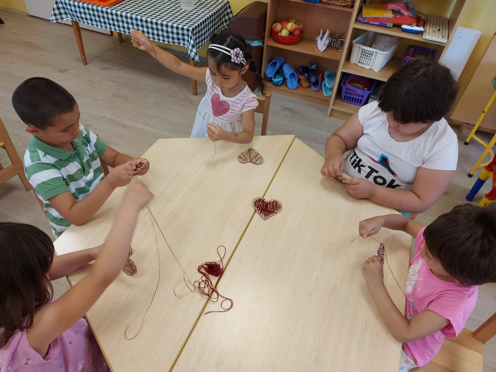 Az e havi választható témakörök közül választottam a „Fonalszív” készítését. A gyerekek nagy türelemmel tekergették a fonalat, gyönyörű szívek készültek. A kisebbek szívecske formára kis, piros négyzetlapokat ragasztottak, ezzel töltötték ki a felületet. Nagy örömmel dolgoztak ők is. Az elkészült szívecskékből egy nagyon szép virágos képet készítettünk, amivel a fali újságunkat dekoráltuk.