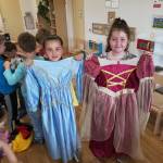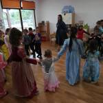 A Bogyó és Babóca nagycsoportosai, csillámport szórva, varázsigével és varázsmozdulatokkal elutaztak Meseországba, ahol különböző meseszereplők ruháit ölthették fel. A lányok, egy hatalmas ládából valogathattak a szebbnél szebb hercegnős, királykisasszonyos, szegény lányos és boszorkányos jelmezek között, míg a fiúk hercegnek, királynak, lovagnak, vándornak vagy éppen szegény embernek öltözhettek fel. Ültettünk mesefát, simogattunk galambokat, lencsét válogattunk, s végül eljártuk a „mesés boldogság” táncát.