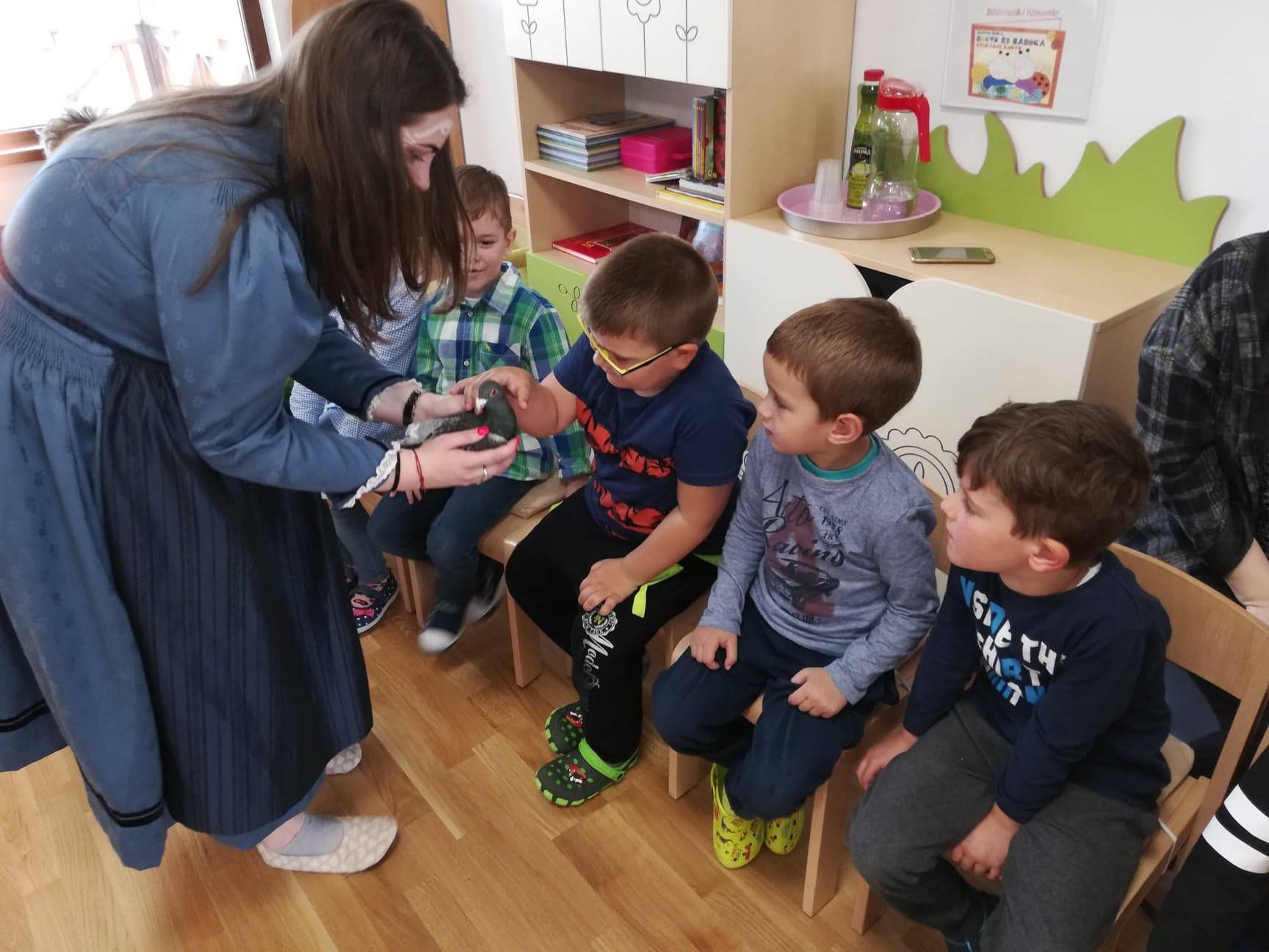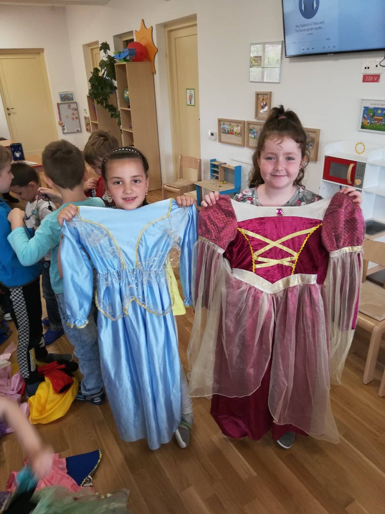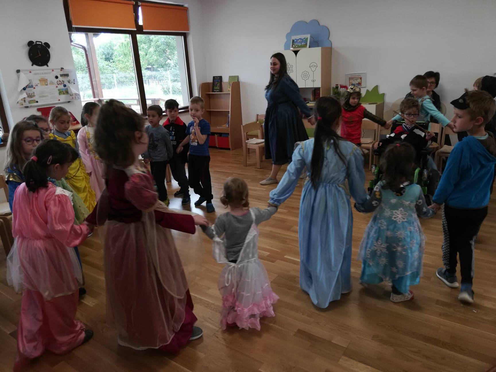 A Bogyó és Babóca nagycsoportosai, csillámport szórva, varázsigével és varázsmozdulatokkal elutaztak Meseországba, ahol különböző meseszereplők ruháit ölthették fel. A lányok, egy hatalmas ládából valogathattak a szebbnél szebb hercegnős, királykisasszonyos, szegény lányos és boszorkányos jelmezek között, míg a fiúk hercegnek, királynak, lovagnak, vándornak vagy éppen szegény embernek öltözhettek fel. Ültettünk mesefát, simogattunk galambokat, lencsét válogattunk, s végül eljártuk a „mesés boldogság” táncát.