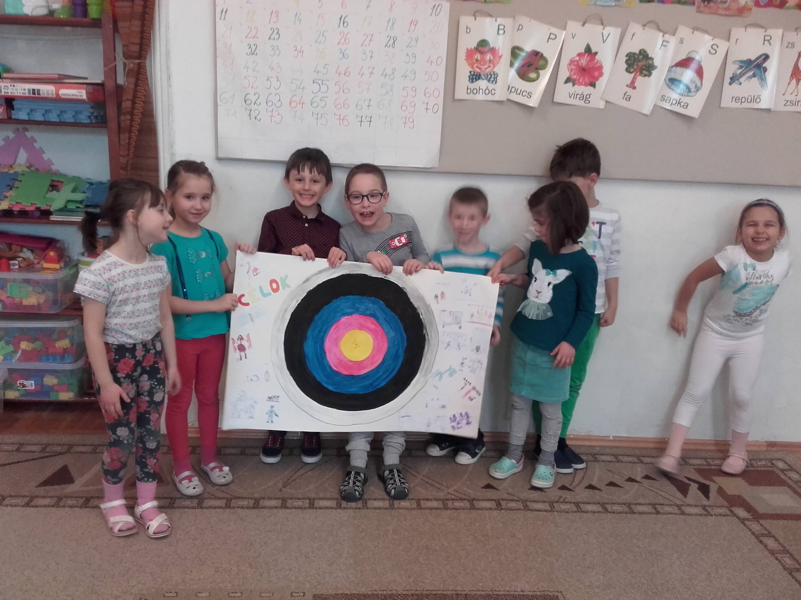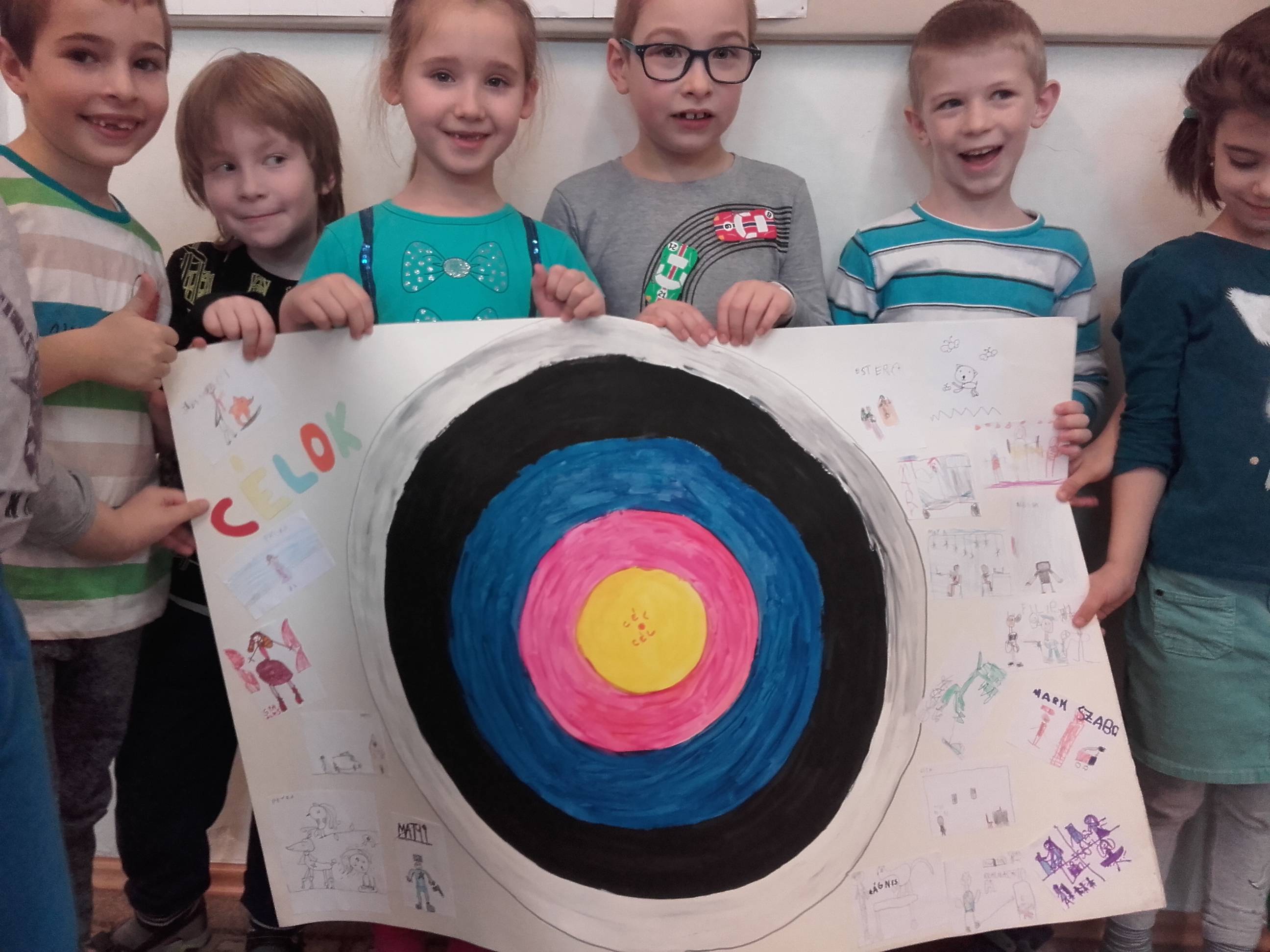 A három kívánság című mese alapján dolgoztuk ki céljainkat és azok elérésének lépéseit egy céltábla segítségevel ( körönként léphetnek magasabb szintre a középponti célhoz: a fehér sáv az óvodai éveket jelképezi, a következő a fekete sáv, az alsó tagozat, majd a felső tagozat, ezt követi a főiskola és végül a cél elérése, a mesterség).
