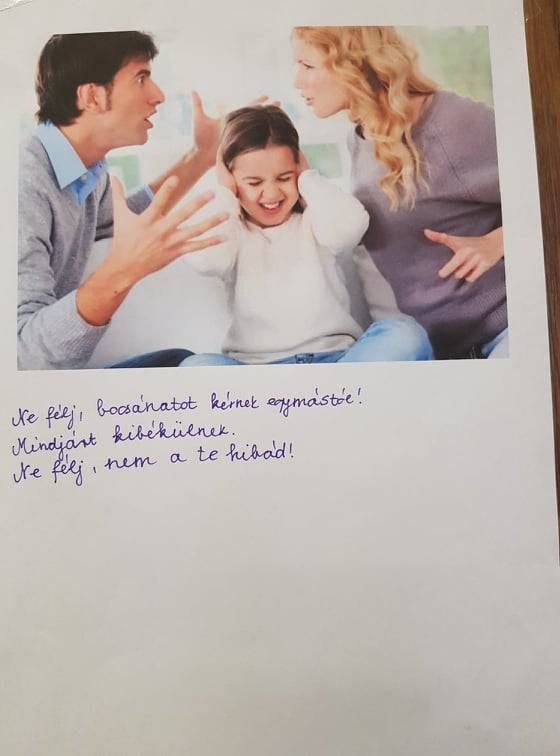 Az első körben felidézhettek a gyerekek egy olyan helyzetet, ami nagy fájdalommal, szorongással, félelemmel vagy nehézség leküzdésével járt. Több más között egy kisfiú az előző napi fogorvosi „élményét” mesélte el: sajnos ki kellett húzni a fogát, mert begyulladt és nagyon fájt neki. Mivel friss volt az „élmény”, jól esett megosztania a többiekkel. Ehhez az osztálytársak is tudtak kapcsolódni hasonlóakkal: vérvétel, izgalom idegen helyen, stb. Sorra vettük azokat a praktikákat, amelyekkel ilyen estetekben saját magunknak segíthetünk, ezeket is a táblára írtam. Kiderült, mindenki próbálta már magát ilyesmivel segíteni egy-egy nehezebb szituációban, és mindenkinek volt legalább egy bevált módszere. Ezt követően jöttek a segítő mondatok. Itt szomorúan hallgattam, hogy csak néhányan tudnak ilyesmit felidézni. Így eljátszottuk a fogfájós kisfiú esetét és néhány mondattal beindítottam az empátiát, jöttek a vigasztaló, nyugtató szavak, mondatok, ölelések, ha ők lennének fájdalommal küzdő kisgyermek szülei, barátai. Ezek fel is kerültek a táblára, majd azt is megbeszéltük, hogy kitől várnak és kapnak ilyenfajta támogatást. Utána képeket közül válogattunk ki ötöt, melyeket előzetesen kinyomtattam és letöltöttem: ezeken először fel kellett ismerniük, hogy milyen problémával küzd a képen szereplő ember, aztán segítő, támogató mondatokat, cselekedeteket soroltak, amelyek felkerültek a képek alá. Jó volt hallani, hogy segítenének, szavakkal, vagy akár tettekkel, öleléssel, simogatással elesett embertársaiknak. A foglalkozások végére ráéreztek arra, hogy saját magukon és egymáson is tudnak segíteni, ha nehéz helyzet elé állítja őket az élet.