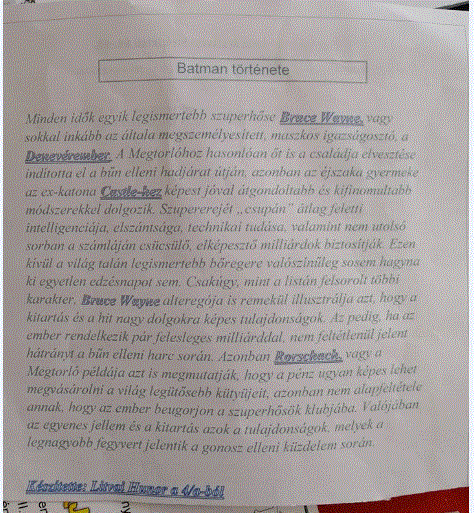 A Nyíregyházi Bem József Általános Iskola 4.a osztályos tanulója egy történeten keresztül mutatja be egy hős pozitív változását.