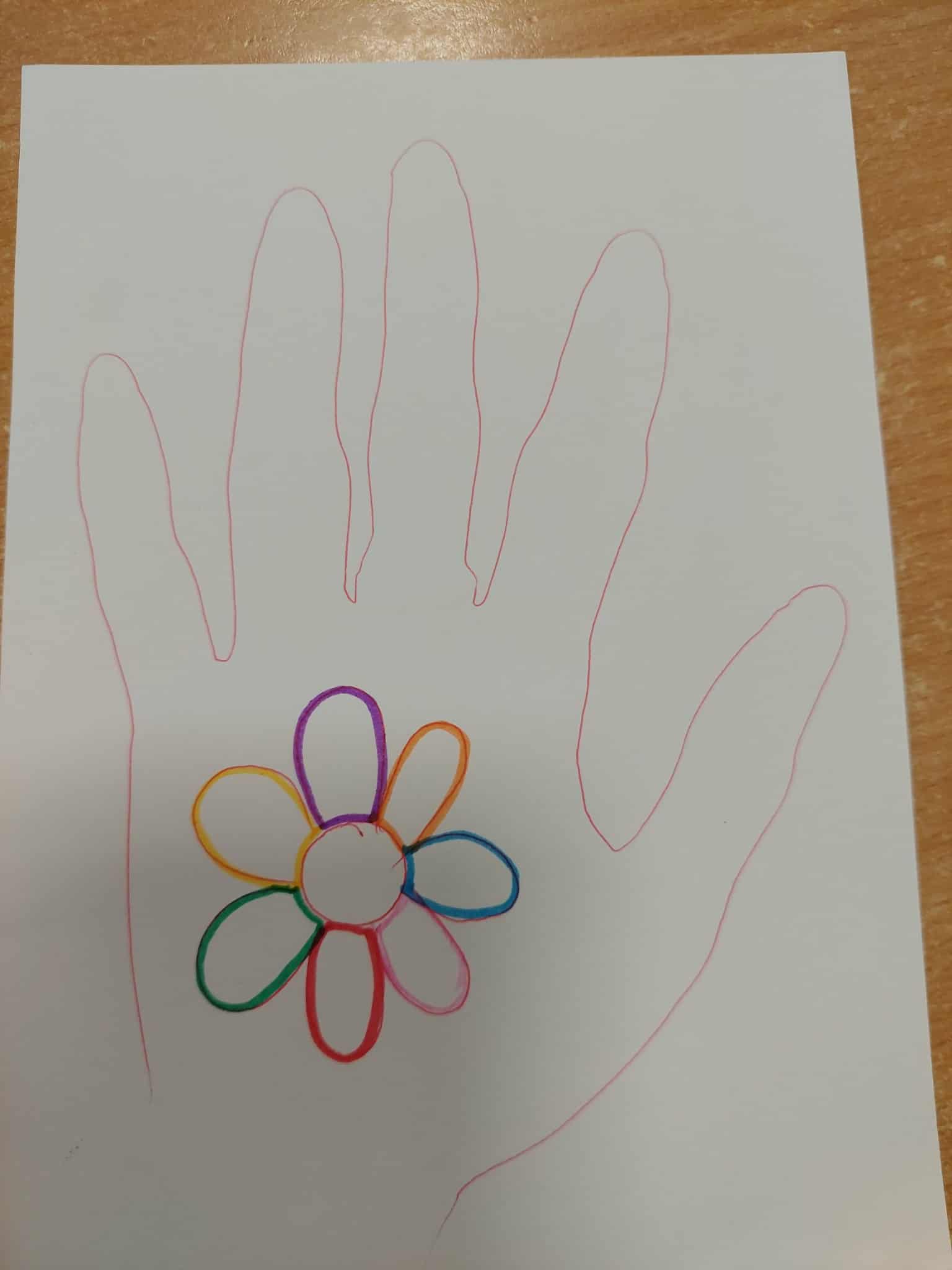 A végén kapott minden gyermek egy rajzlapot, amire rá kellett rajzolniuk a kezüket HÁLA KÉZ, valamint a HÁLA VIRÁGOT is. Nagyon ügyesen megcsinálták, hiszen az óvodában is készítettünk már hasonlót. Minden gyermek elővette a tolltartóját és a színes ceruzákkal szépen kiszínezték. Egy kislánynak el volt törve a bal keze, ezért segítettem neki a keze körbe rajzolásában, amiért nagyon hálás volt nekem. Amikor elkészültek, többen nekem szerették volna adni a gyönyörű rajzokat. Megkértem őket, hogy vigyék haza inkább és mutassák meg a szüleiknek és adják oda hálájuk jeléül, tegyék ki otthon olyan helyre, ahol bármikor láthatják.