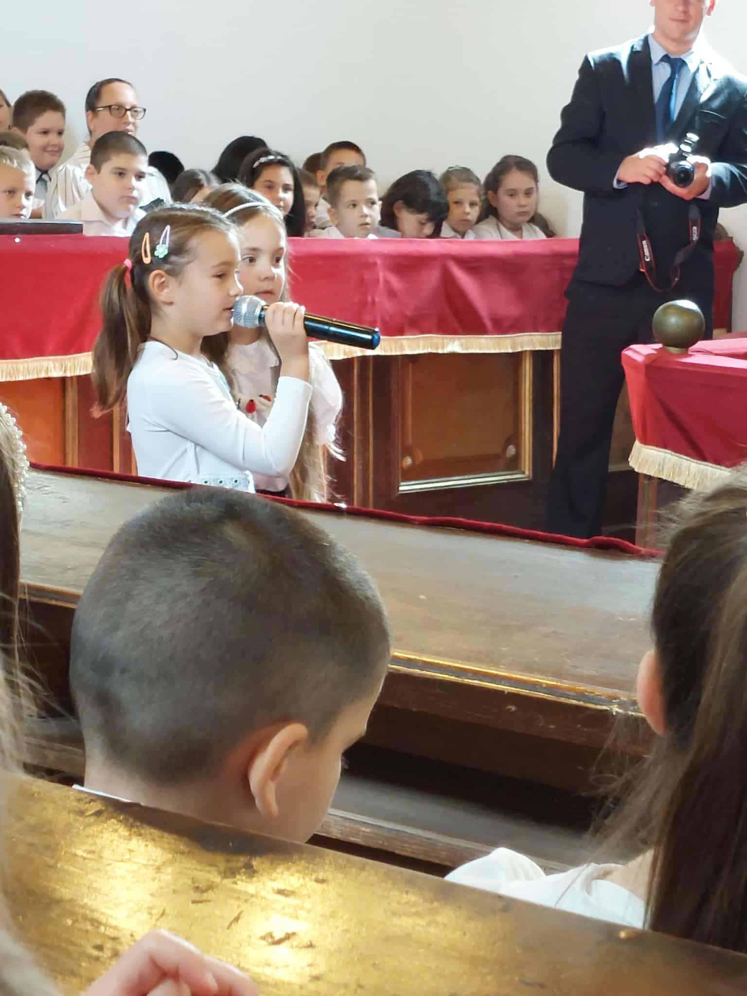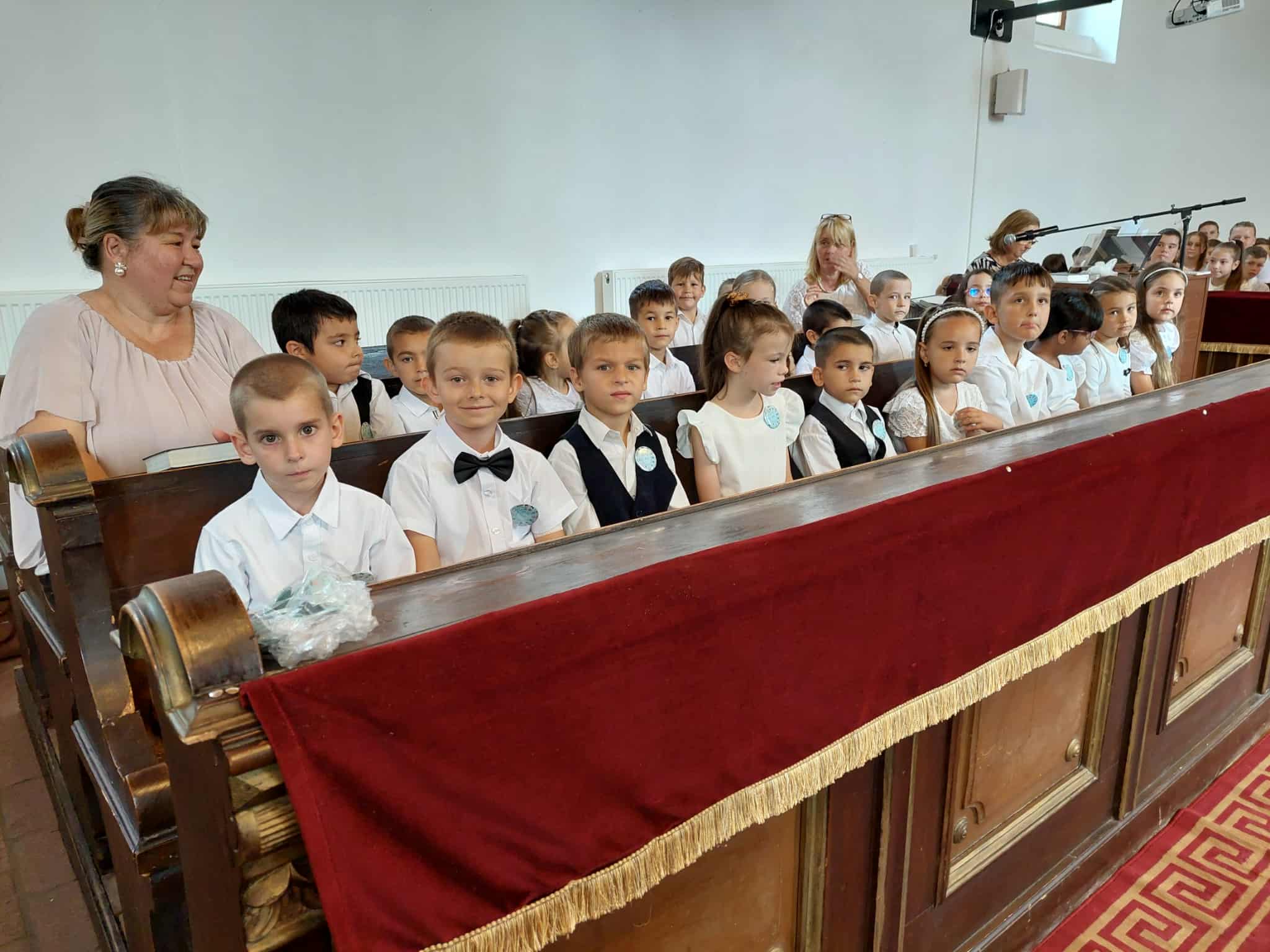 Az első osztályosoknak én voltam az óvónénije, ezért nagycsoportban már tartottam a Boldogságórákat. Azért is tettem, hogy majd első osztályban könnyebbé tudjam tenni az óvoda-iskola átmenetet Boldogságórákkal. A mesterprogramomnak a fő célja, hogy segítsem a gyermekek beilleszkedését az iskolába. Elkezdődött a tanév. Az évnyitón már ott voltam a Református Templomban és egy kis ajándékkal kedveskedtem a még kicsit bátortalan elsősöknek. Ahogy odaérkeztem, a gyerekek örömmel köszöntek. Odaültem közéjük, hogy ezzel is segítsem, oldjam a feszültséget. Így már nagyobb biztonságban érezték magukat a volt nagycsoportosaim. Az Igazgató Úrral és a tanító nénikkel megbeszéltem, hogy ott fogom átadni a gyermekeknek a kitűzőket, amire rá van írva, hogy: „Pá ovi, irány az iskola!” Egy kisfiú és egy kislány megy rajta iskolatáskával a hátán. Nagyon büszkén viselték a gyermekek, amíg hallgatták az igazgató bácsi megnyitó beszédét. Úgy láttam, hogy segített a gyermekeknek ez a kis ajándék abban, hogy ne szorongjanak annyira, hogy biztassuk őket az iskolás életre. Az egyik kisfiú megkérdezte, hogy holnap te is jössz, ott leszel az iskolában? Megnyugtattam, hogy jó kezekben lesznek a tanító nénikkel, akik szintén velem együtt várták a gyermekeket, ahogyan gyülekeztek a templomban.
