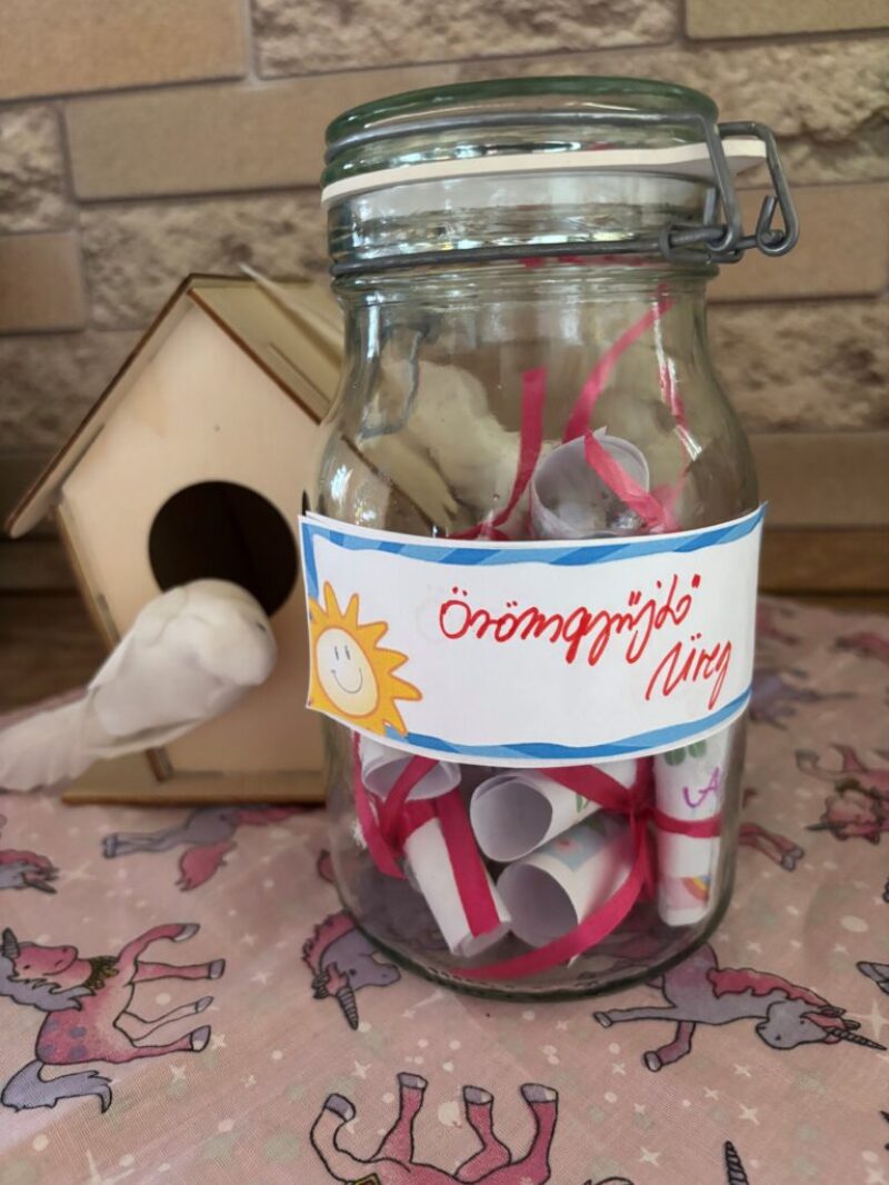 A foglalkozás zárásaként elkészítettük az „Örömgyűjtő üveget”, amely egy látható boldogságforrás. A gyermekek rajzzal vagy jellel rögzíthetik benne az apró örömeiket, amelyeket később visszaidézhetnek.