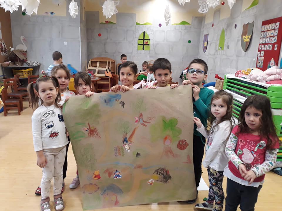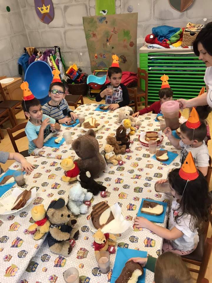 Ebben a hónapban közös célunk az volt, hogy eljussunk Micimackóhoz uzsonnázni, amire meghívót is kapott minden gyermek és a kedvenc mackója. Az út azonban nem volt egyszerű, hiszen sok próbán kellett átesni ahhoz, hogy megérkezzünk. Nekiálltunk tehát a térkép megrajzolásának. Az első állomás Fülesnél volt, aki elvesztette a farkát, és bennünket kért meg, hogy keressük meg. Küldetésünk sikeres volt, így másnap Tigrissel tornáztunk egyet. Következett Bagoly, akitől nagyon sok okos dolgot tudtunk meg a medvékről. Nyuszival érdekes feladatokat és játékokat játszottunk, Malackával pedig sapkákat készítettünk az uzsonnára és mézes csuprokat,majd Kangával tornáztunk ismét egy jót. Hosszú út vezetett az uzsonnáig, amit közösen kellett megtennünk. A gyerekek nagyon élvezték a közös célért való küzdést, és örömmel fogyasztották el a jól megérdemelt uzsonnát.
