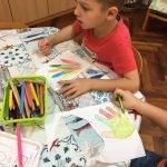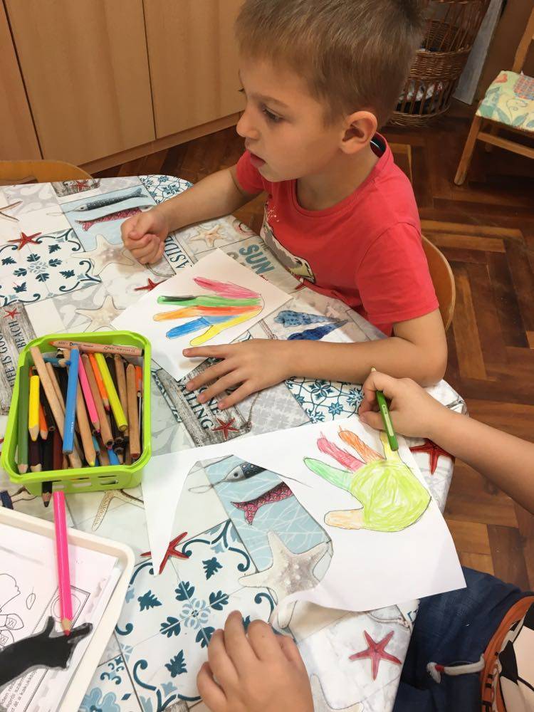 A rajzasztalnál mindenki körberajzolta a saját kezét, majd az ujjaikat különböző színűre, és közben megkértem Őket, hogy gondoljanak öt dologra, amiért hálásak. Végül az összes „falevél” felkerült a mi „Hálafánkra”.
