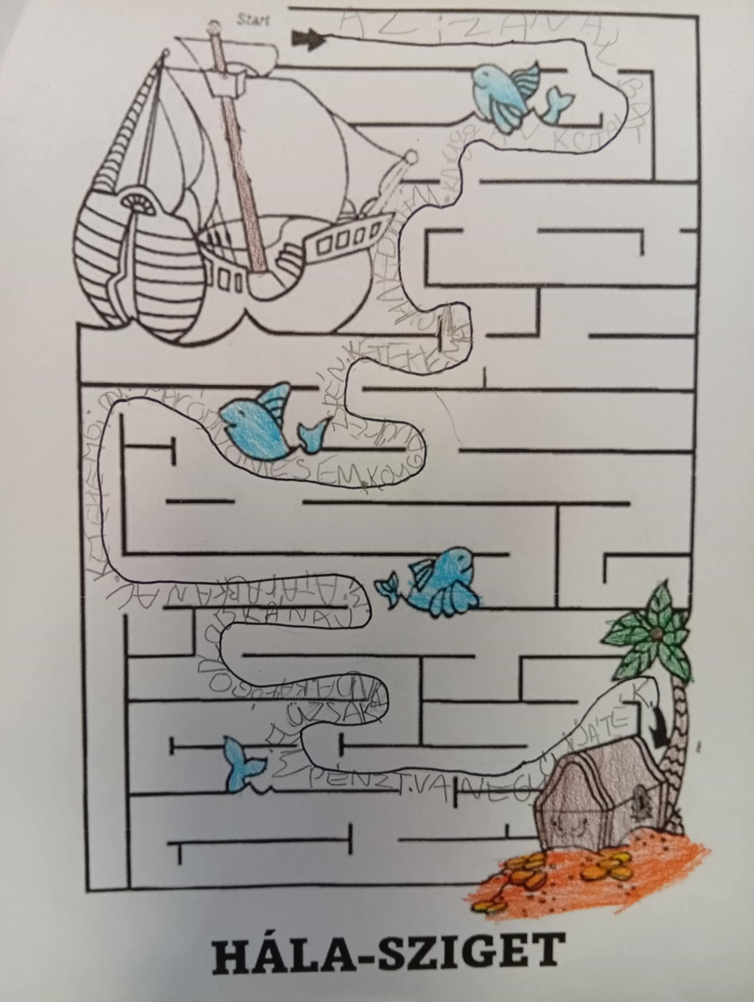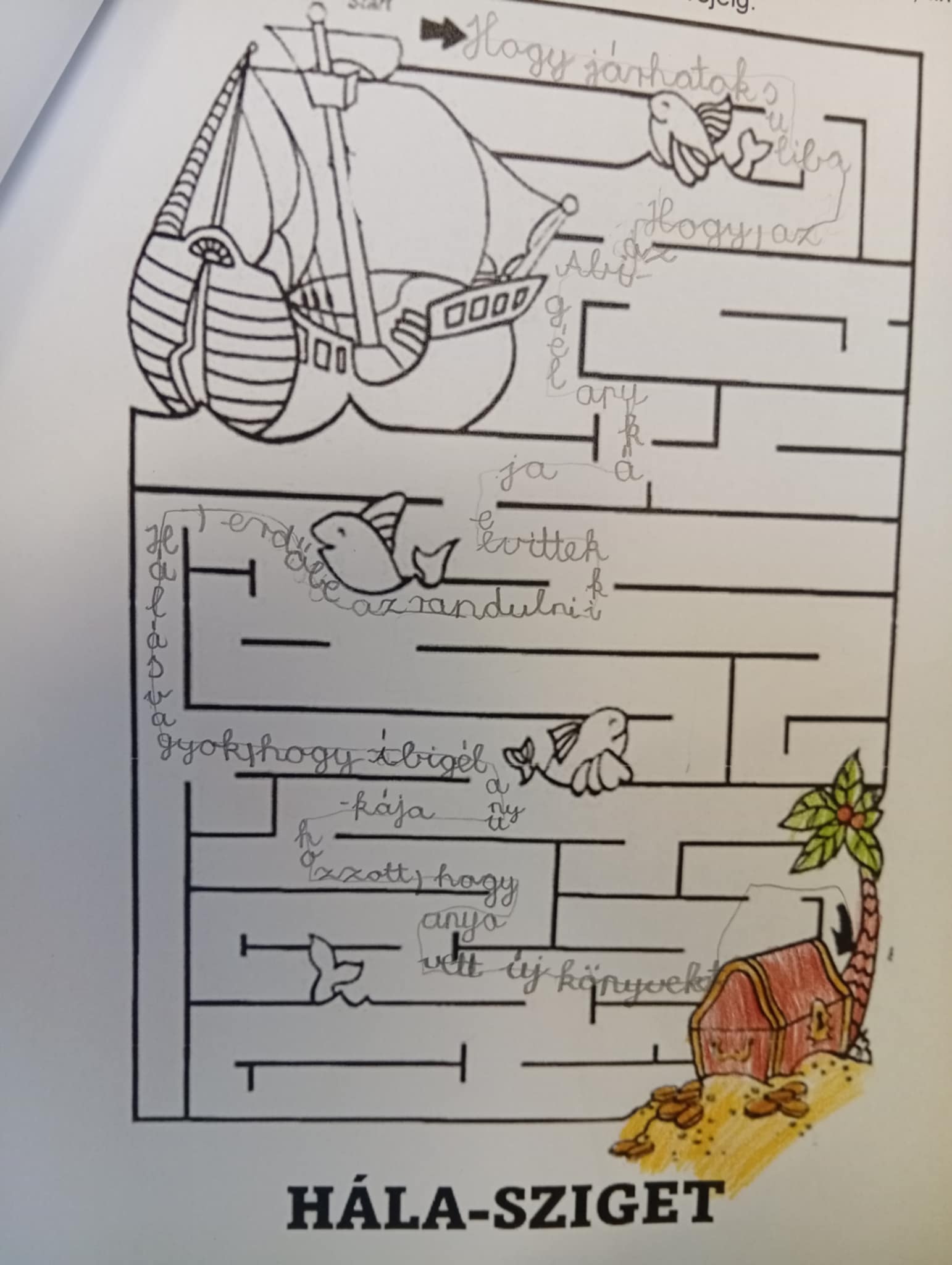„A hajó úticélja a Hála szigete. Nem elég kijelölni az utat a tengeri labirintuson. A hajót a hála viszi előre: írj rá erre a kacskaringós útvonalra mindig egy-egy hálát, amit érzel! Ha mindannyian partot érünk, a sziget lakója egy finom „hála befőttel” vár Benneteket! Kalandos utat kívánok! A szigeten találkozunk!”