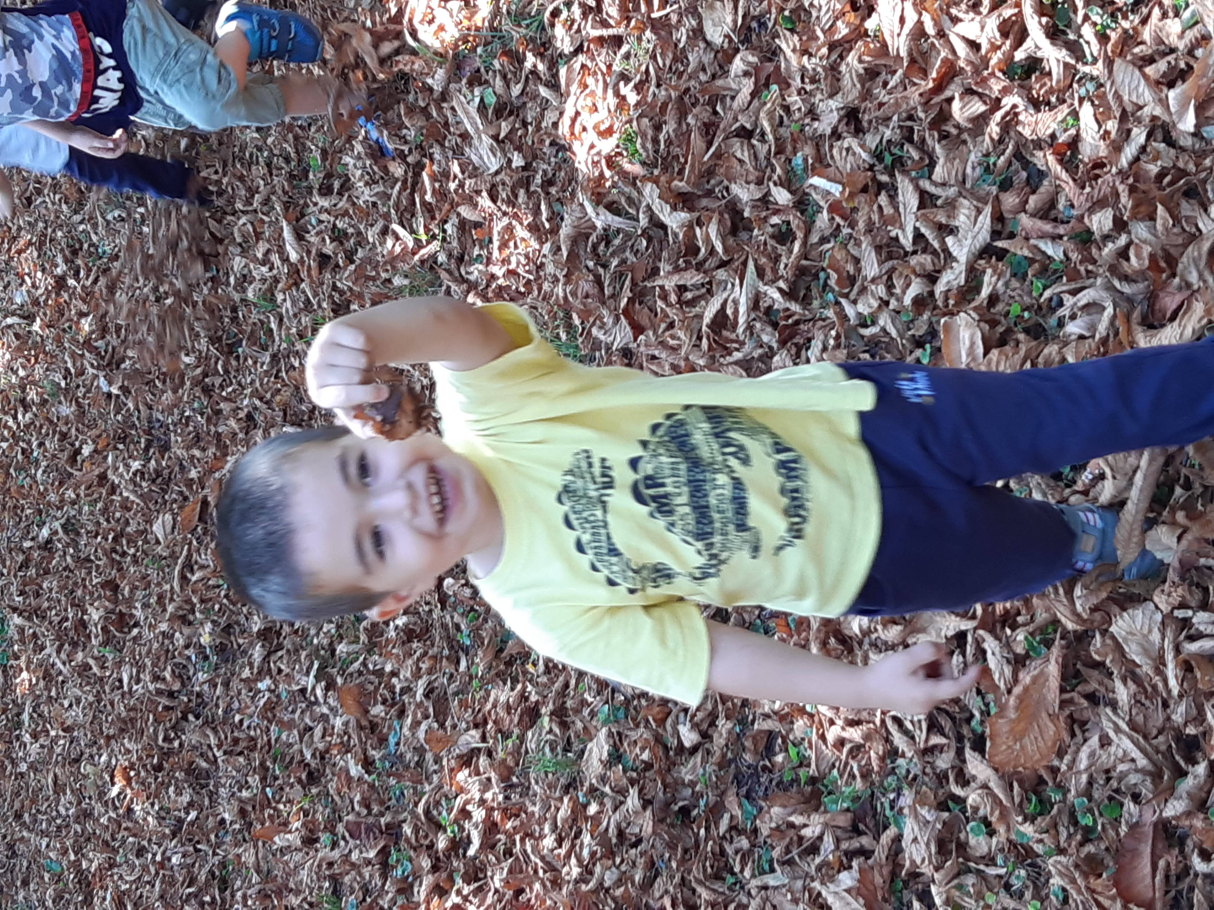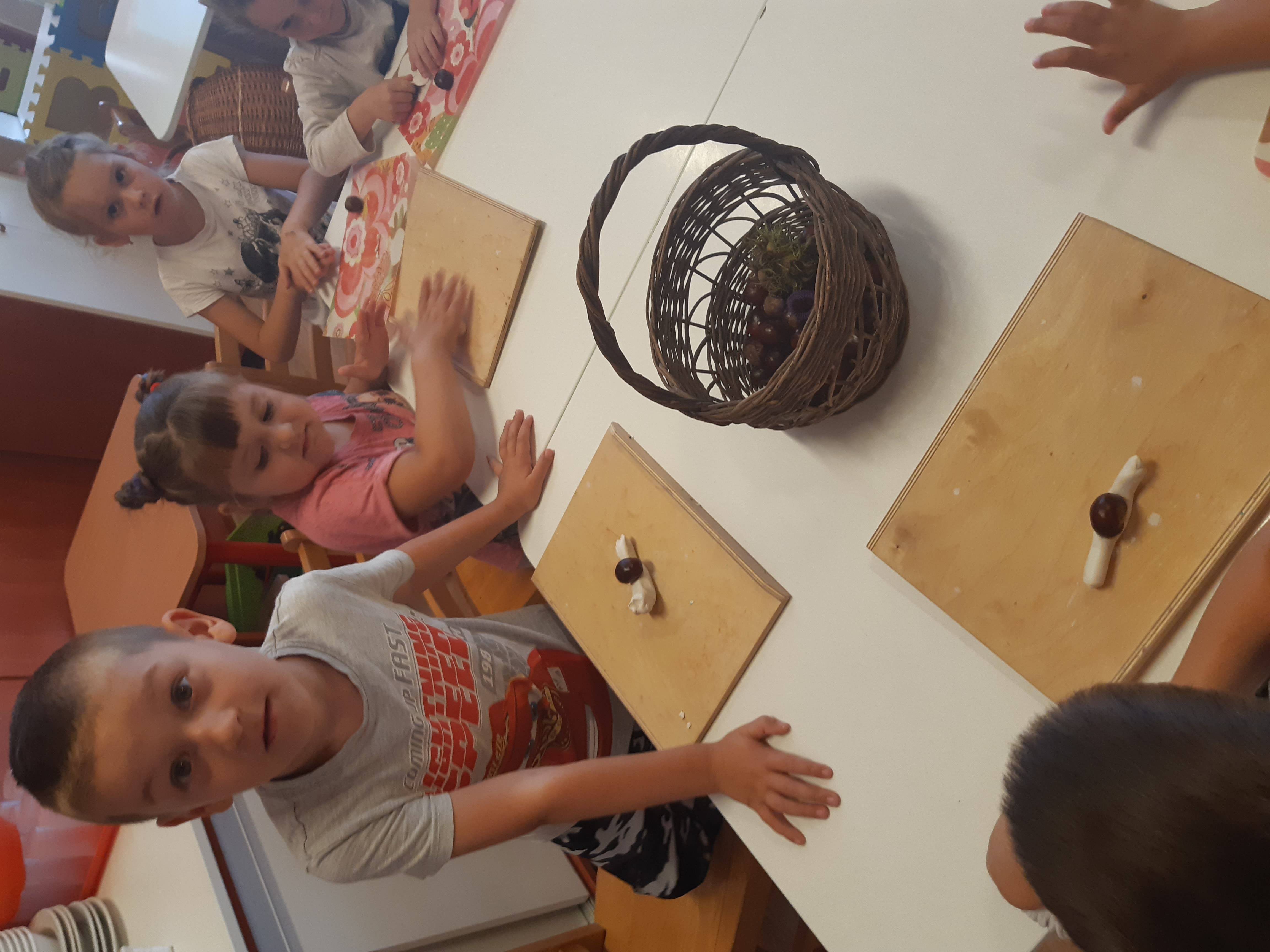 Boldog Dóra segítségével elmeséltem a Hálafa történetét, amit rajzokkal illusztráltam. Mese után beszélgettünk, majd több alkalommal felelevenítettük a történetet. Szerencsések vagyunk, mert a településünkön van egy gyönyörű liget közel az óvodánkhoz, mely a Wenckheim család birtoka volt. Jó idő esetén mindig elsétálunk oda és a gyerekek ott élvezhetik a friss levegőt, szabadon játszhatnak a csodás környezetben. Közben megfigyeltük, hogyan változnak a fák, terméseket gyűjtöttünk, amiből később állatokat készítettünk. A gesztenyéből gyurmával csigát készítettek a gyerekek. Egy kislány azt mondta alkotás közben, ő hálás azért, hogy szedtünk gesztenyét, mert így legalább tudtunk csigát készíteni.