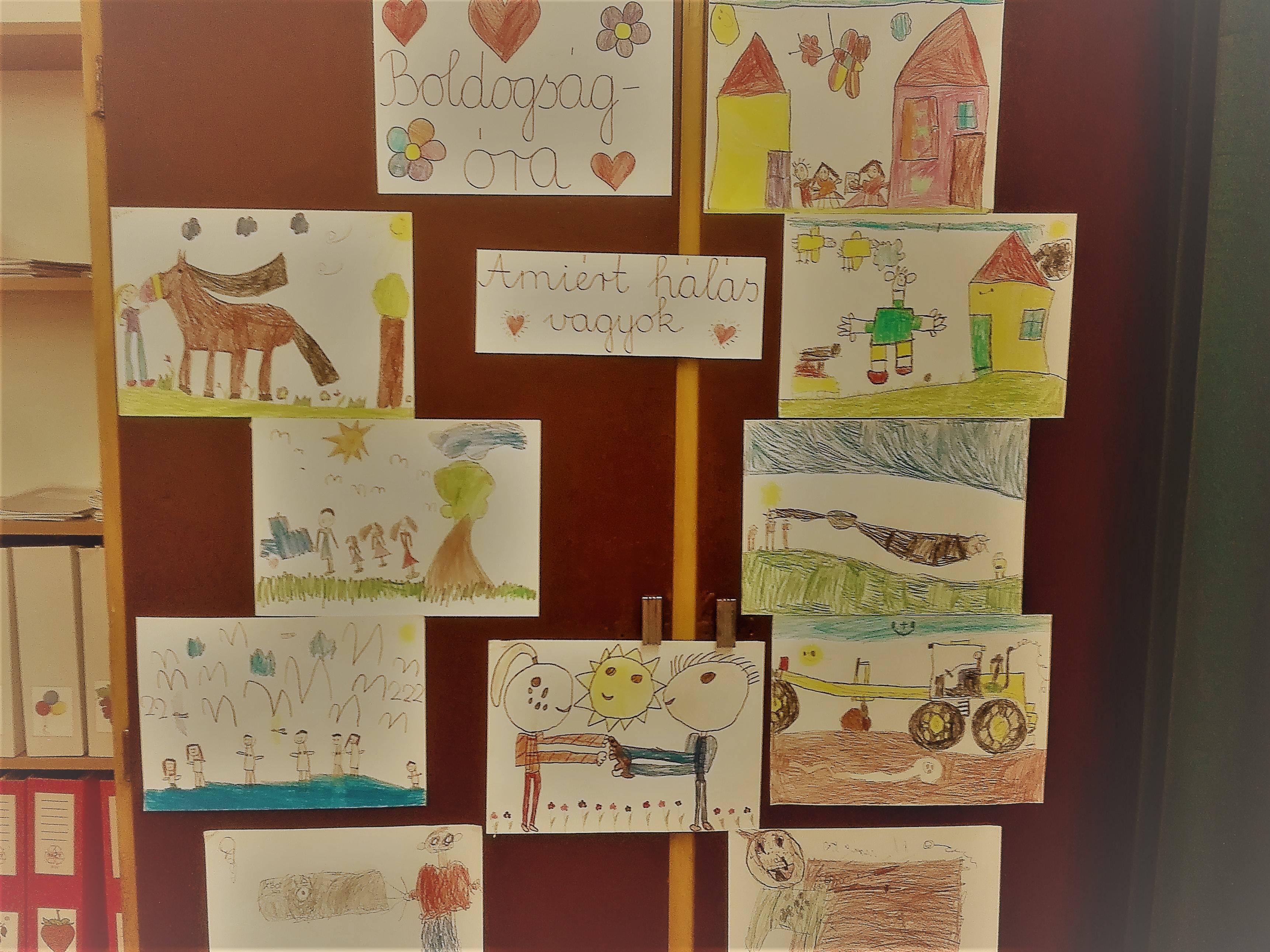 Első osztályos a csoport, most ismerkedünk a programmal. Énekeltünk, meséltünk, közben lerajzoltuk a mese kedvenc szereplőit. Majd arról beszélgettünk, kinek és miért vagyunk hálásak. Ezt fejezik ki a rajzok.