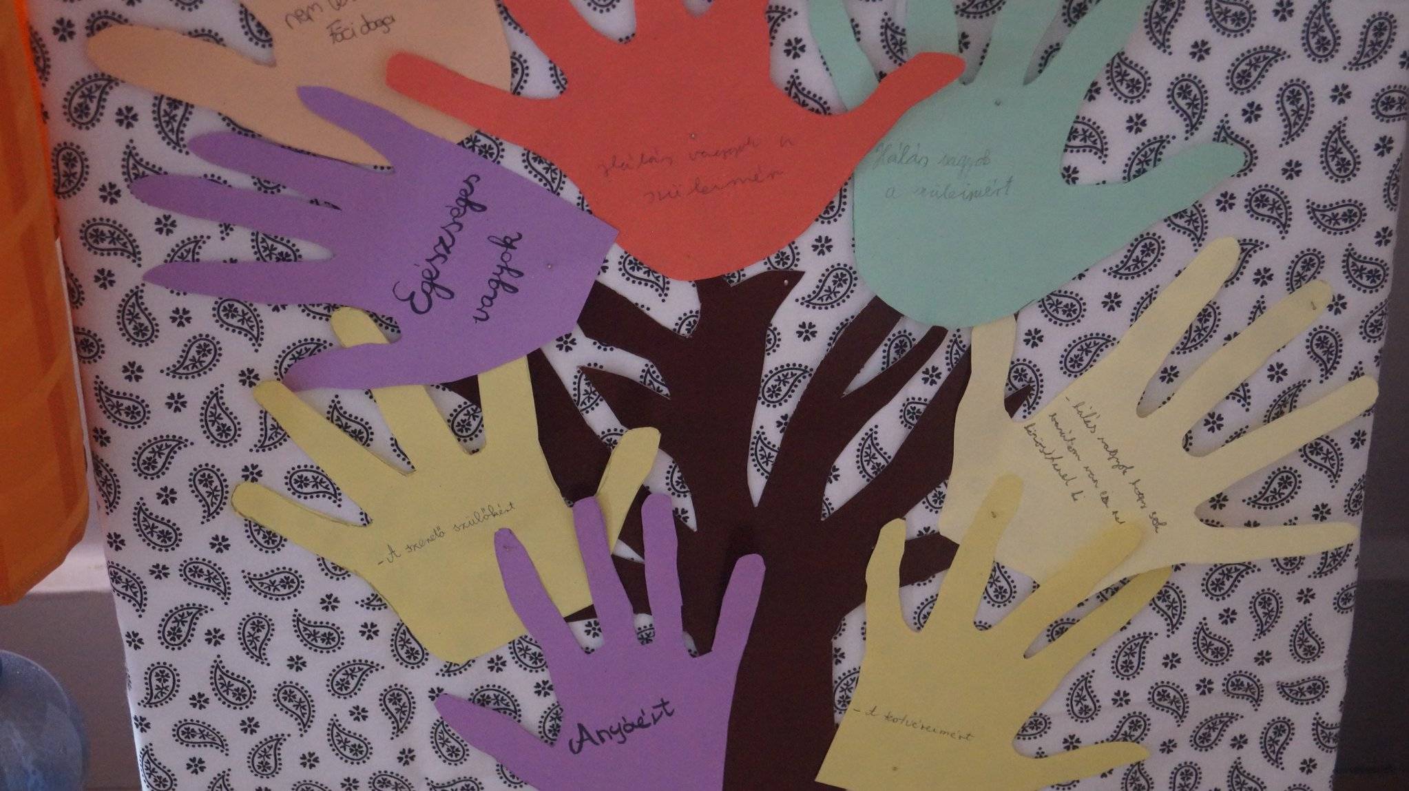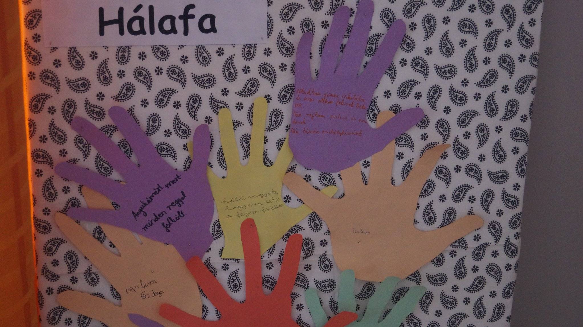 Majd mindenki kapott egy színes papírt amelyen körberajzolták a kezüket, majd kivágták és ráírták , volt aki egy szóval, volt aki bővebben ráírta a lenyomatra, hogy miért hálás. Majd elkészítettük az osztály hálafáját.
