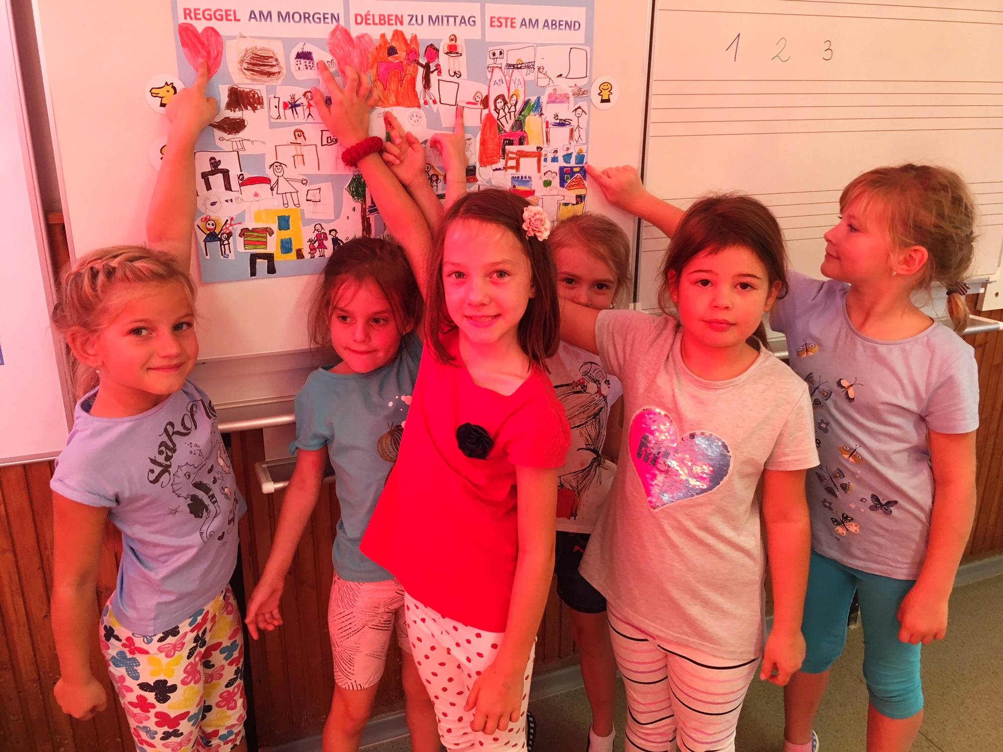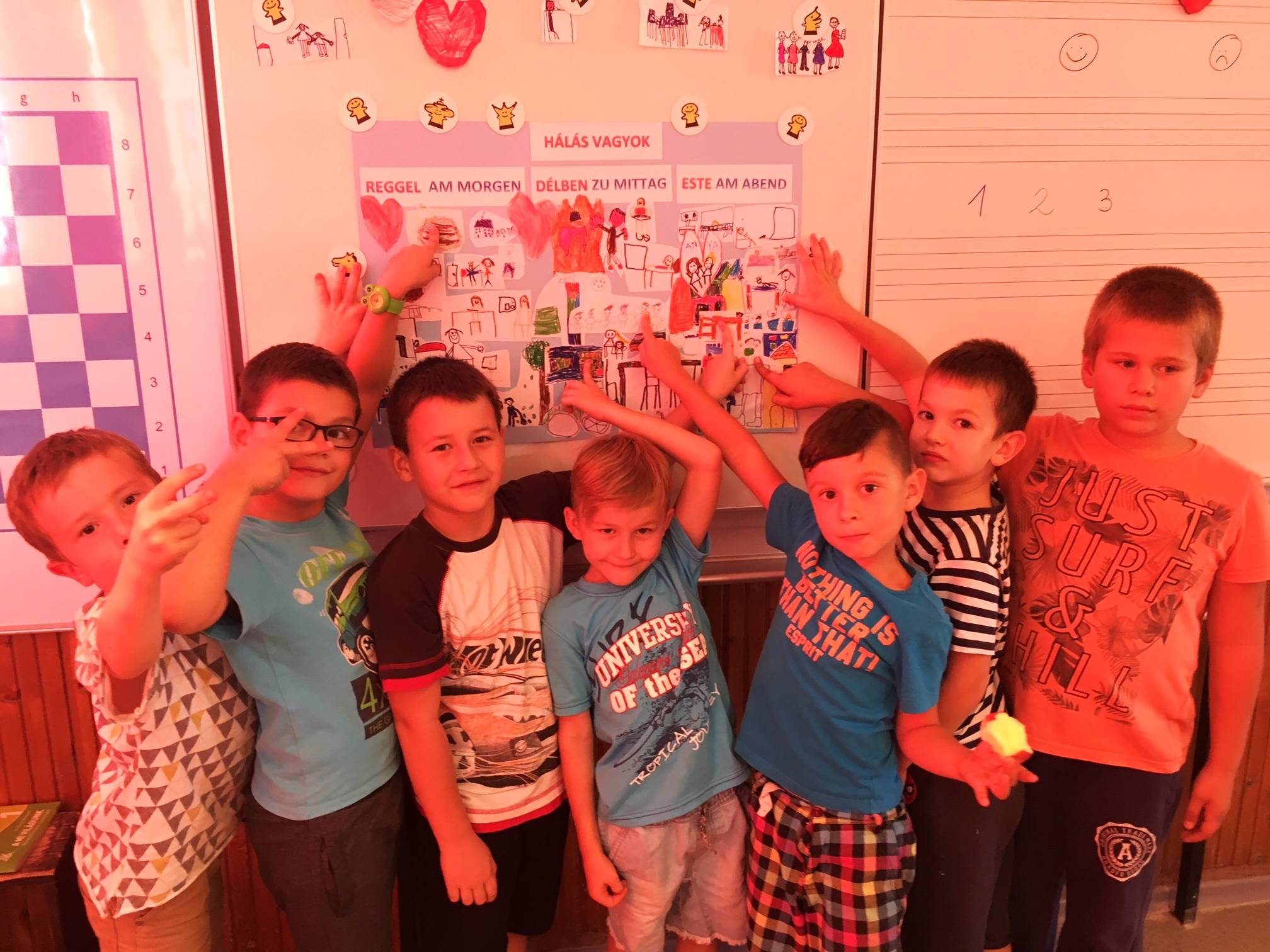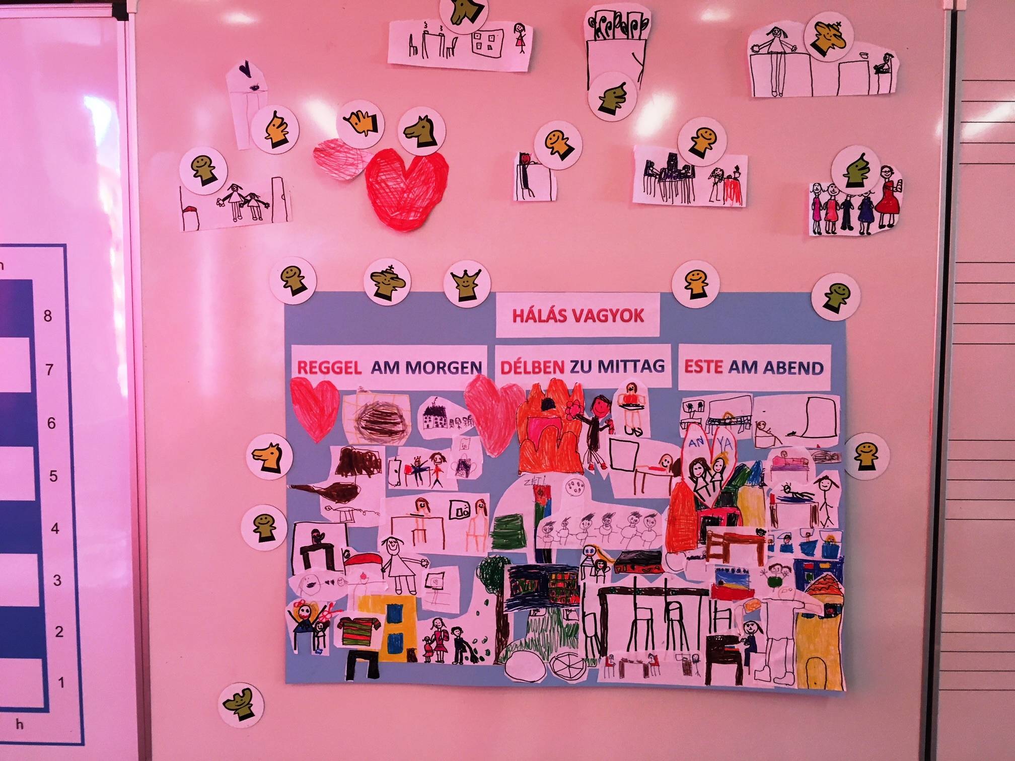 Az elsősökkel folytatott beszélgetések után (hogy miért lehetnek hálásak) minden tanuló rajzokat készített arról, hogy miért hálás. Ezeket a rajzokat körbevágták és felragasztottuk egy közös plakátra.