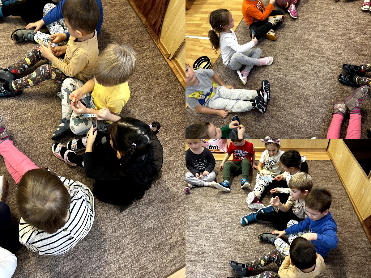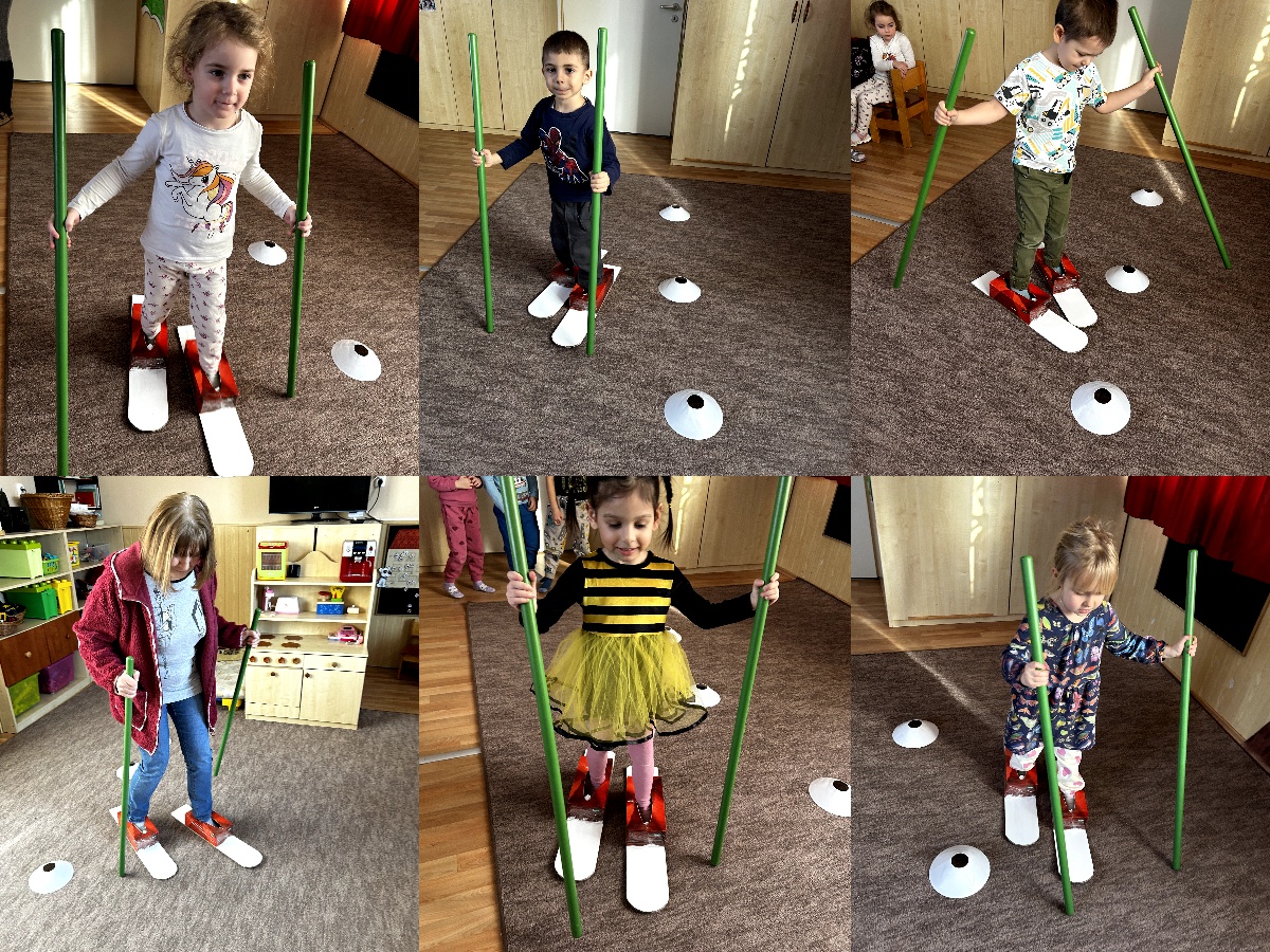 A mozgásos játékok során a tornaszobában hógolyócsatát rendeztünk kislabdák segítségével. A játék nemcsak felszabadító mozgásélményt nyújtott, hanem szabálykövetésre, önkontrollra és egymás tiszteletben tartására is nevelte a gyermekeket. Megbeszéltük a játékszabályokat, és közösen figyeltünk arra, hogy mindenki biztonságban érezze magát. Ezt követően a „terem síelés” fortélyait sajátítottuk el, amely során a gyermekek játékos formában fejlesztették egyensúlyérzéküket, mozgáskoordinációjukat és kitartásukat. A kezdeti bizonytalanság után egyre magabiztosabban mozogtak, ami jól példázta, hogyan vezet a gyakorlás sikerélményhez. Ehhez természetesen a csoportban dolgozó felnőttek közös munkája elengedhetetlen volt, hiszen mindenkire komoly feladat várt. Volt, aki a gyerekeket húzta, akadt, aki a lábacskákat hómentesítette és volt, aki a havat biztosította a megfelelő élmény elérésének érdekében.