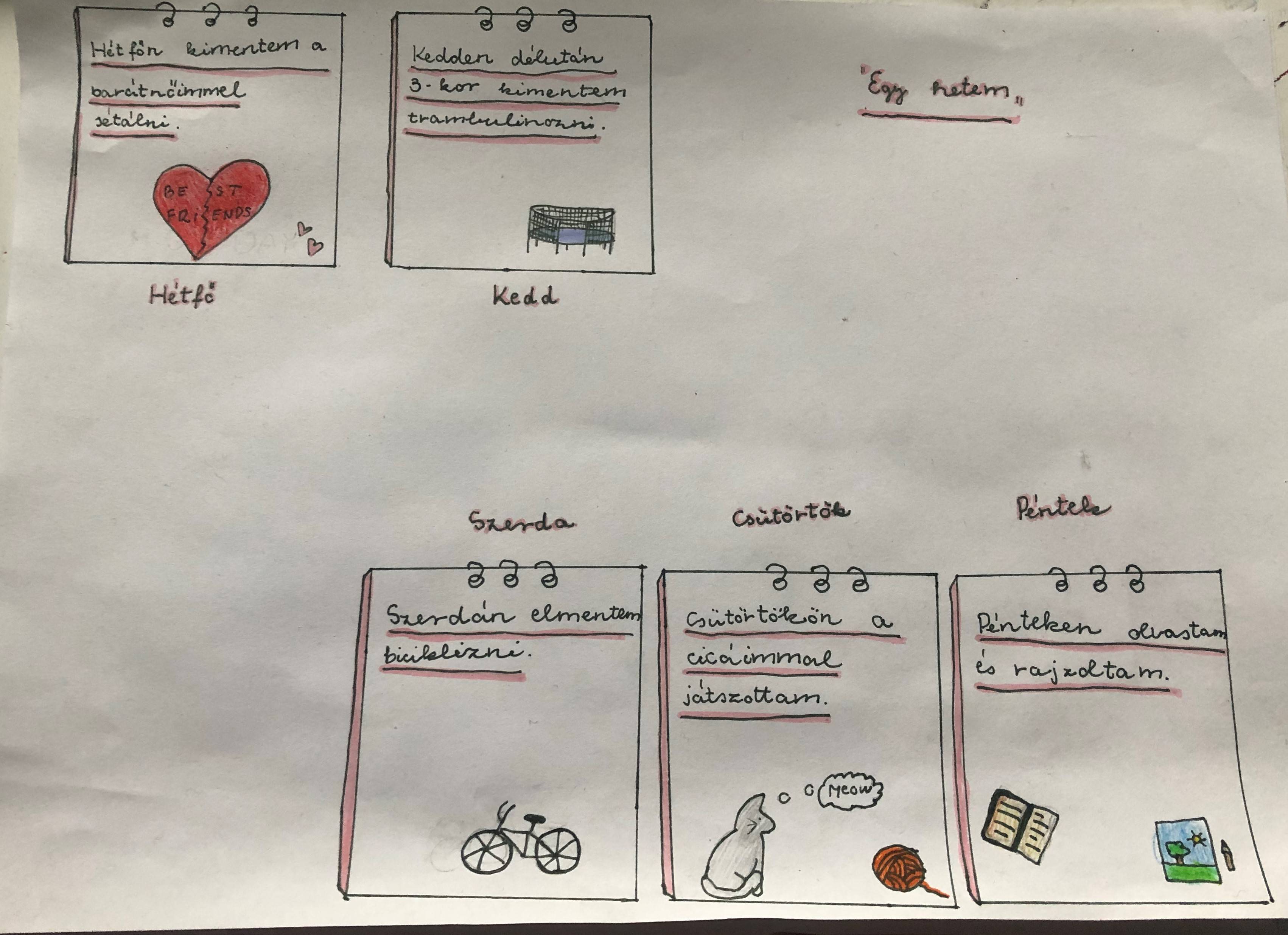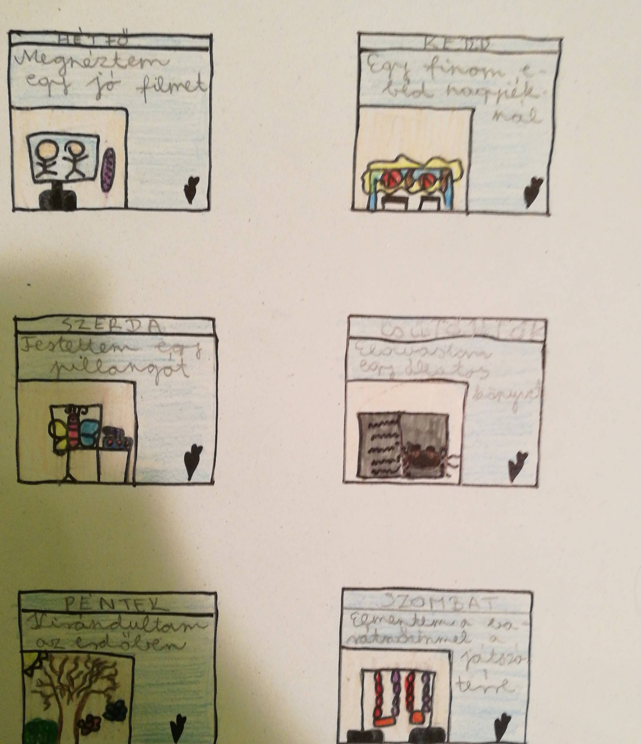 A gyerekeknek azt a feladatot adtam, hogy gondolják át, milyen apró örömök érték őket egy teljes héten keresztül. Ezt dokumentálták, és többen lerajzolták. Örültem neki, hogy ebben a nehéz időszakban is megtalálták azokat a tevékenységeket, dolgokat, amik boldogságot hoztak az életükbe.