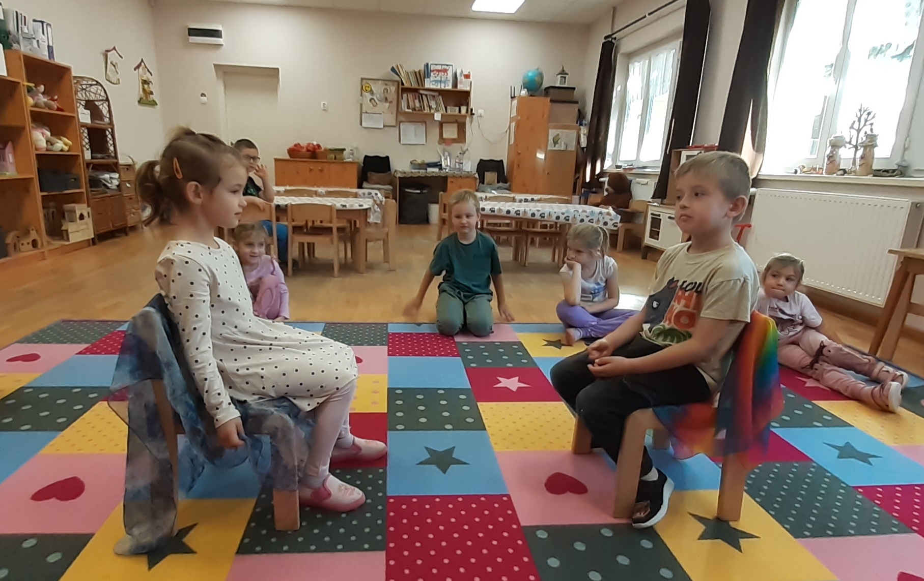 Egymással szembe raktam két széket, melyeket leterítettem szép, színes kendőkkel. „Aki erre a székre leül, csak a jót látja meg a másikban.” A páronként leültetett gyerekek egymás jó tulajdonságairól beszéltek. Érdekes dolgokat mondtak, tanulságos volt hallgatni.