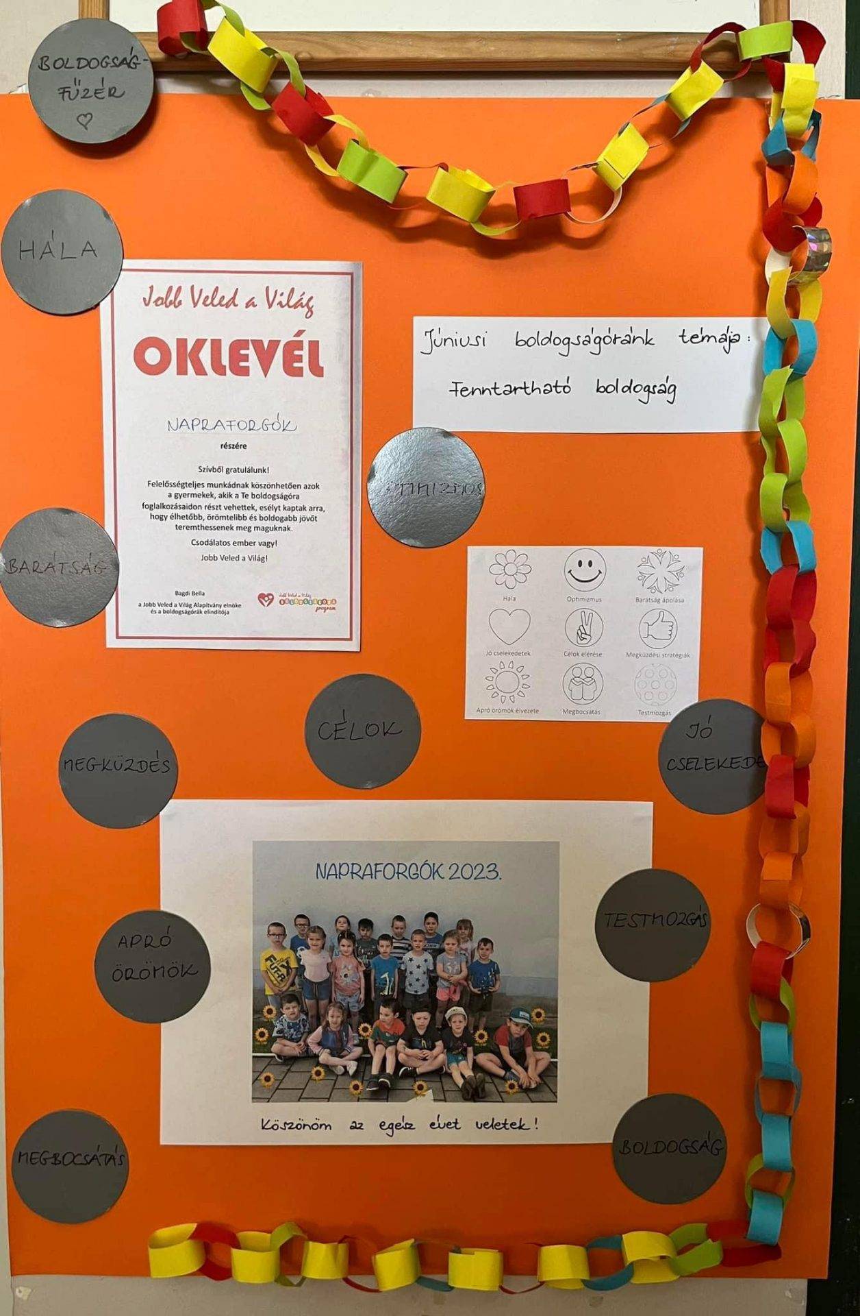Nagyon büszke vagyok, hogy egy újabb sikeres évet hagyunk magunk mögött. Az „Apró örömök” témakörben ismét elnyertük a „Hónap csoportja” címet. Nagyon büszkén sétálok végig óvodánk öltözőjében, ahol gyakran nézegetem az okleveleinket. Az idei évben új helyet kellett keresnünk elismeréseinknek, mert a folyosón már nem fértek el.