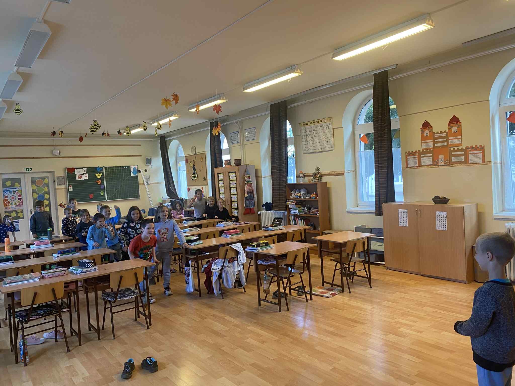 Ebben a játékban van egy közlekedési lámpát játszó gyermek, ő háttal áll az osztálynak.