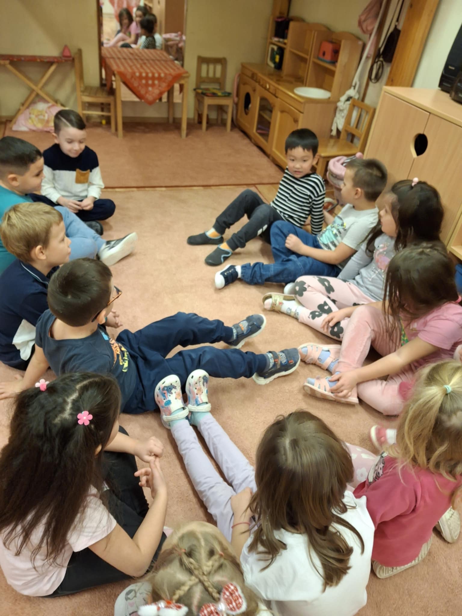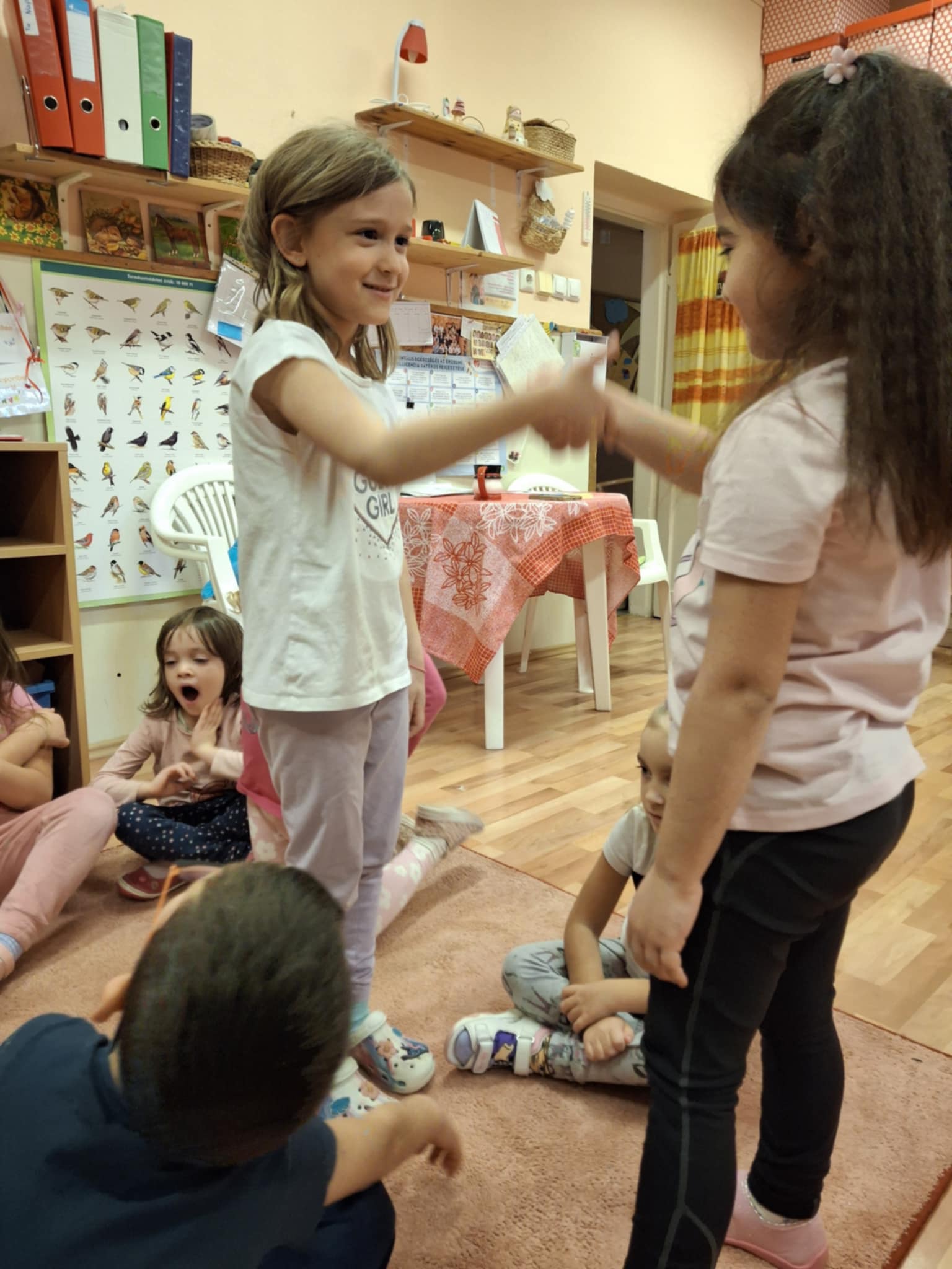 A szeretetkörben a baráti kapcsolatokról, azok pozitív hatásairól sokat beszélgettünk. Számos cselekedettel bebizonyítottuk milyen jó barátnak lenni ,és barátokra lelni. A társas kapcsolatok erősítése érdekében játszódtuk a „Szervusz kisbarátom” játékot, amikor a gyermekek kezet fogtak , egymás szemébe néztek és megkérdezték a barátjukat, hogy van. Papagáj bemutatón vettünk részt, ahol rájöttünk, hogy a madaraknak is vannak barátaik, társaik.