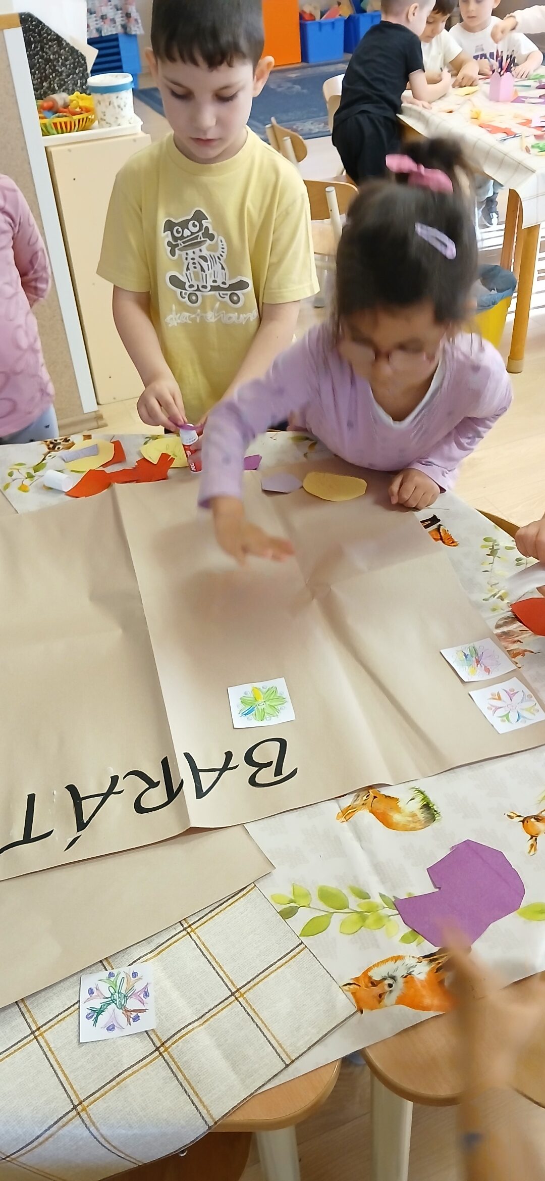 A tevékenység kezdetén elmondtam a gyermekeknek, hogy az embernek szüksége van a közösségre, a kapcsolatokra, barátokra, ami nemcsak a lelki jólétünk miatt, de az egészségünk szempontjából is igen fontos. Ezt követően még mindig körben ülve minden gyermek megkérdezte a mellet ülőtől, hogy: „kis barátom, hogy vagy?”. A beszélgetés már önmagában is fejlesztette az érzelmi tudatosságot, kommunikációs készséget. A beszélgetőkört követően A három kő és a híd c. mesét adtam elő a gyerekeknek mókus kesztyűbáb és kavicsok segítségével. Ezt követően három gyermek, akik a követ jelképezték egymás mellé álltak, és eljátszottuk, hogyan segítettek a kis mókusnak átjutni a túloldalra. A mesét követően minden gyermek kiszínezte a barátság jelét, amit felragasztottunk egy közös plakátra, amire rákerültek a barátságvirágok is. A virág szirmait, közepét a gyermekek saját maguk vágták ki, melynek közepébe rajzolták a jelüket, a szirmokra pedig a barátok jelét. A kézműves tevekénységet követően közös várépítés következett, melybe minden gyermek nagyon szívesen bekapcsolódott. A tevékenységet Bagdi Bella: Ha boldog vagy, mutasd meg mindenkinek c. dalával zártuk. A gyerekek önfeledten táncoltak, énekeltek, ölelték egymást. Nagyon jó érzéssel töltött el, látva, hogy a csoportba járó gyerekek mennyire szeretik egymást, hogy kimondták egymásnak, hogy a barátod vagyok.