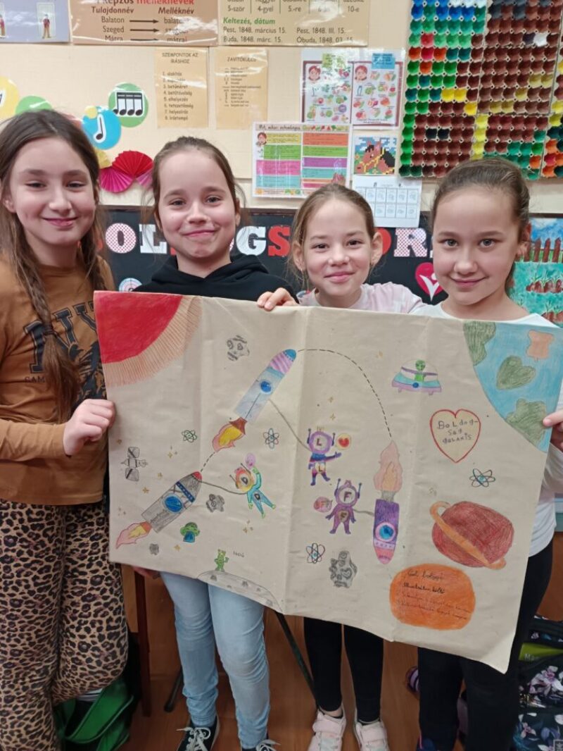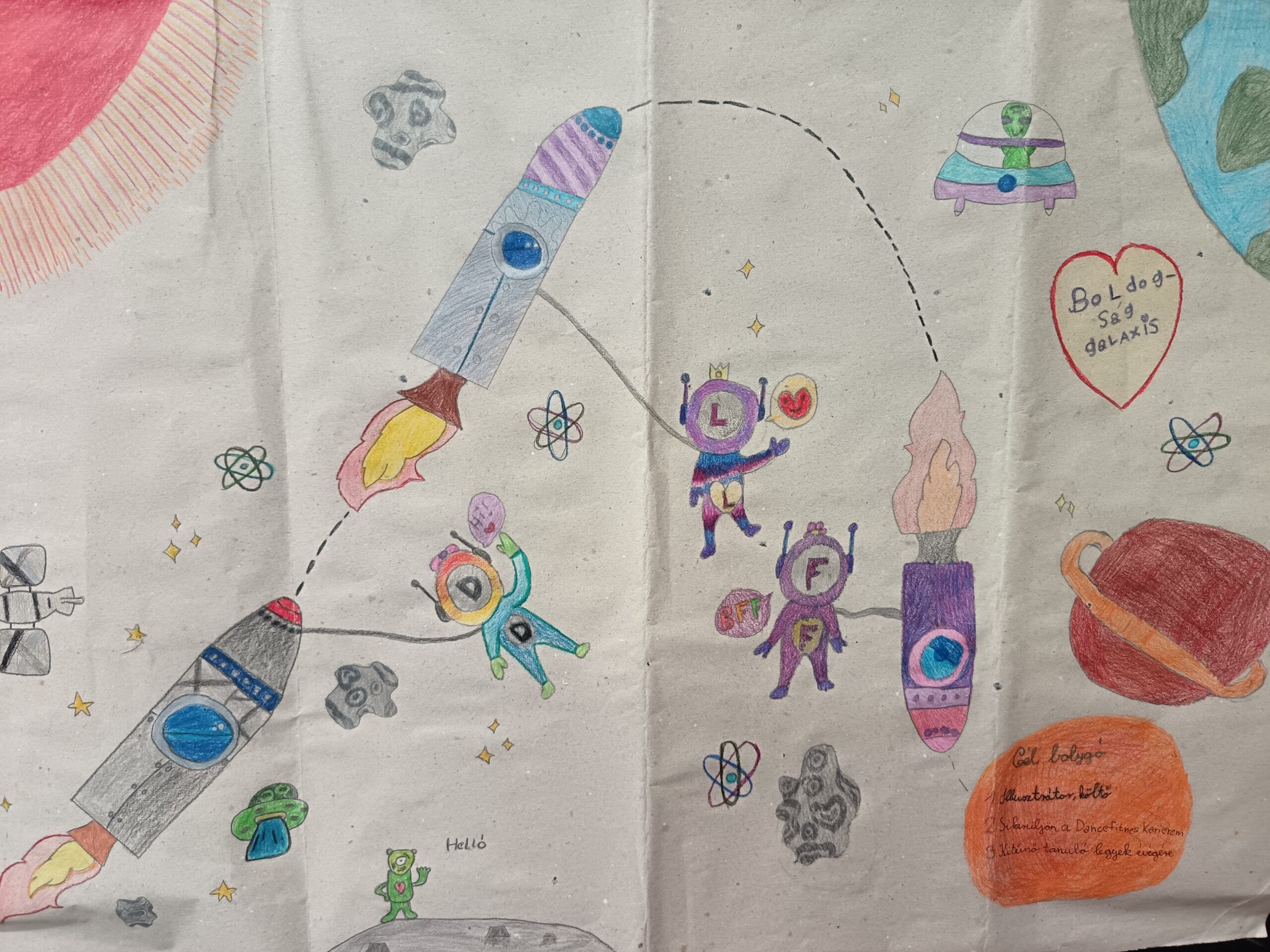 Január hónapban sokat beszélgettünk és alkottunk. Nagyon kedvelték a dalt: „Van nekem egy álmom!” Készítettek céltáblát, milyen lépések szükségesek a saját céljaik eléréséhez. Beszélgettünk közeli és távoli céljainkról. Arról, mi kell ahhoz, hogy ezeket elérhessük. Milyen erősségeink vannak, hogy segítsenek bennünket. Megalkották űrhajóikat, melyek a Boldogság galaxisban a Cél bolygó felé tartanak.