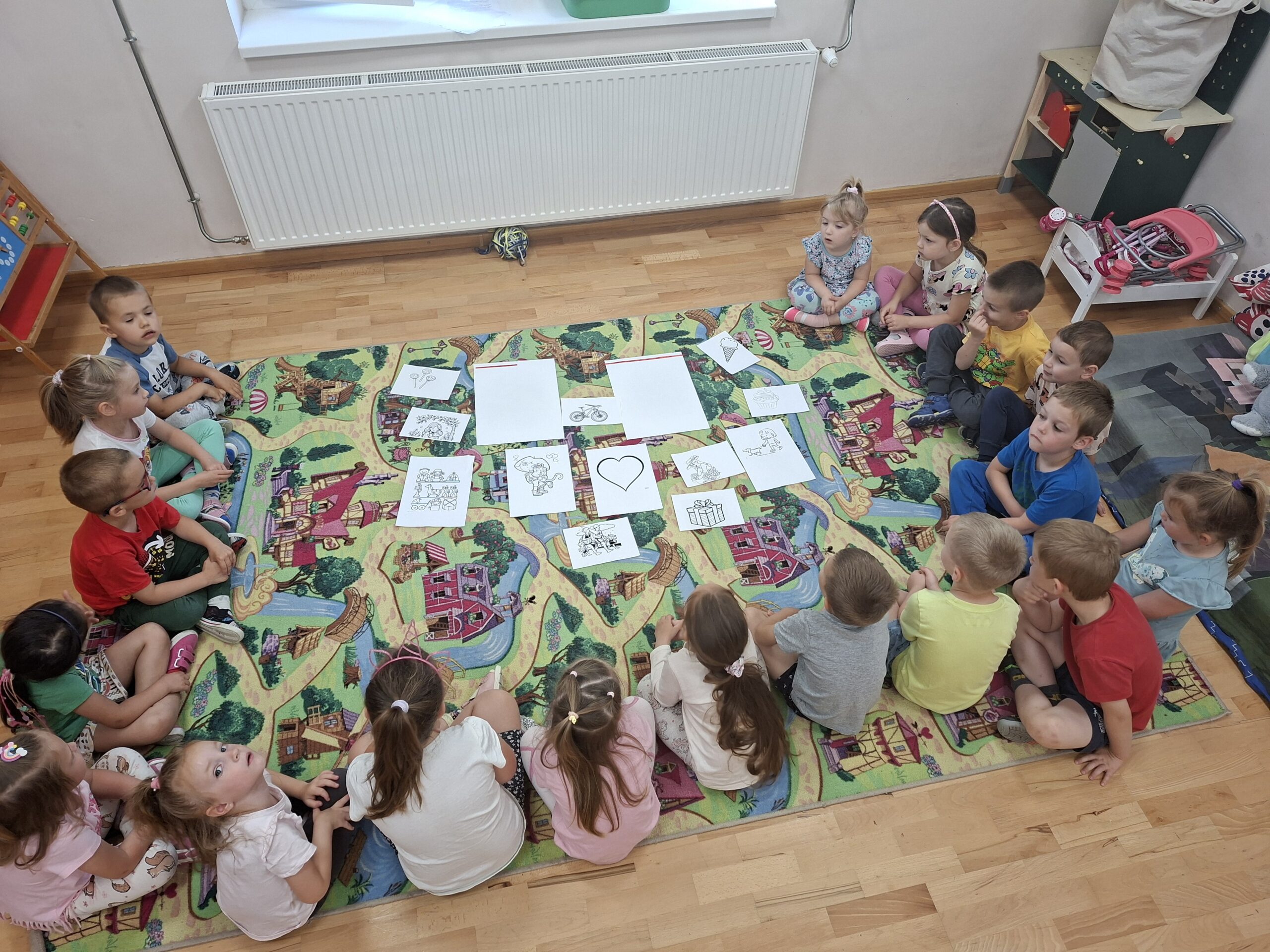 A gyerekeknek a képeket a megfelelő helyre kellett tenniük, aszerint, hogy mely dolgok okozhatnak boldogságot hosszú távon és melyek csak rövid ideig. Érdekes és elgondolkodtató volt hallani, hogy egy-egy képről mi jutott eszükbe, mit fogalmaztak meg.