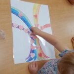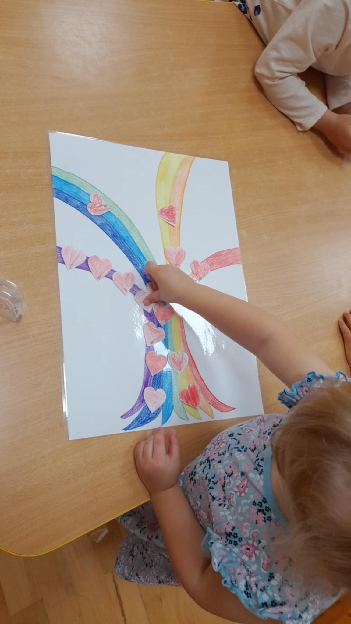 A tevékenység lezárásaként közösen készítettünk egy Boldogság-Szivárvány-Család fát. Egy szívet színezett mindenki, melyet a fa ágaira ragasztottunk, a fa leveleiként. Megbeszéltük, hogy mi egy nagy, boldog család vagyunk és ezt szimbolizálja a közös fánk is.