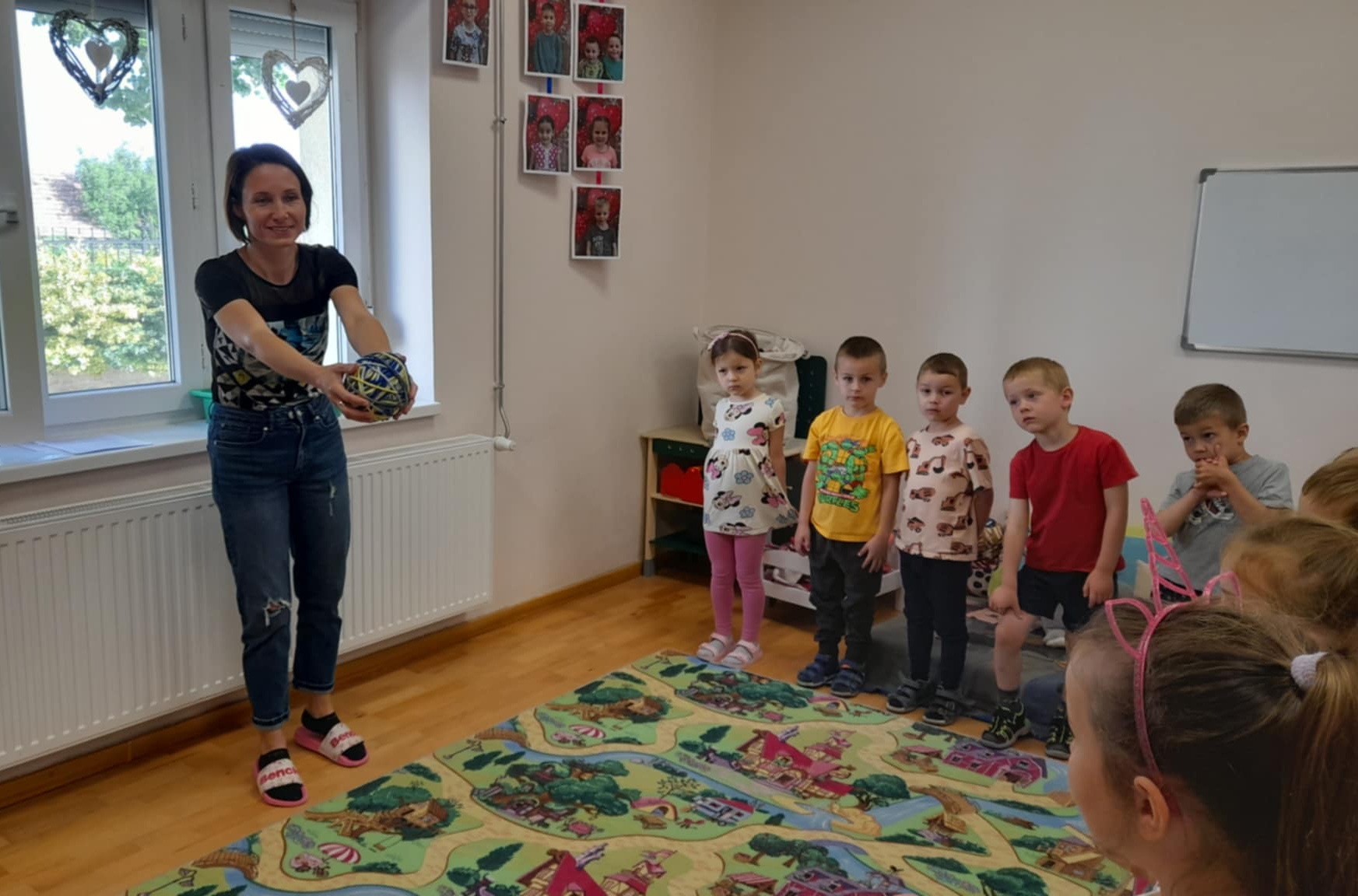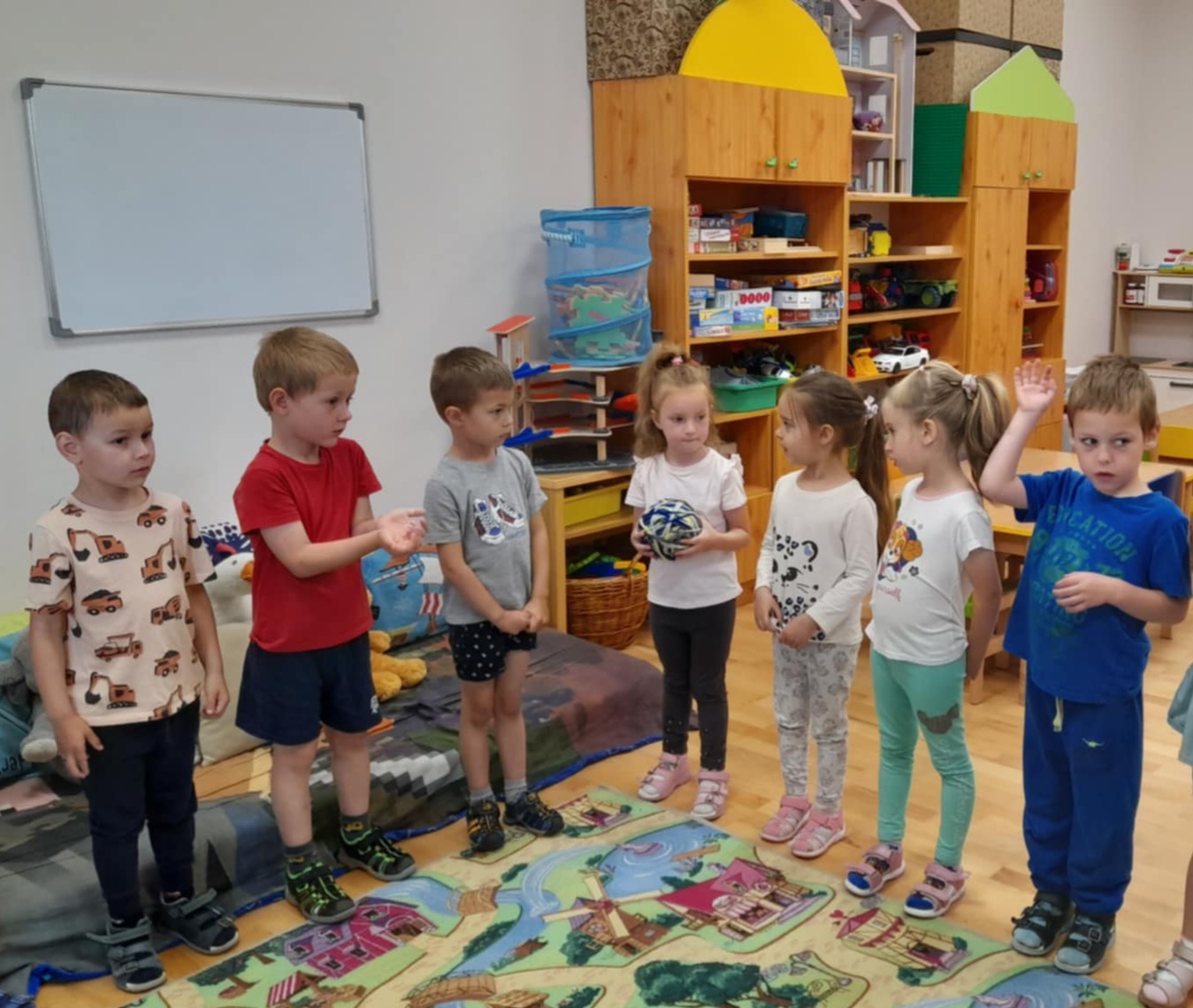 Boldogságkörrel indítottam a tevékenységet. A szőnyeg köré álltunk. Felmutattam a varázsfonalat, amit most labdának neveztünk ki. Aki megkapta a boldogság labdát elmondott valamit, amitől boldogságot érzett valamikor. Volt olyan, aki nem tudott válaszolni, ilyenkor kérdésekkel segítettem (Boldog vagy amikor valaki megölel?). A legtöbb kisgyermek a barátsághoz, családhoz, állatszeretethez kapcsolódó dolgokat mondott: pl.: Boldog vagyok, amikor a cicáimat simogathatom. Boldog voltam akkor, amikor anyáékkal elmentünk Egerbe. Boldog voltam tegnap, hogy Nándi játszott velem. Boldog vagyok, mikor a barátom átjön hozzám.)