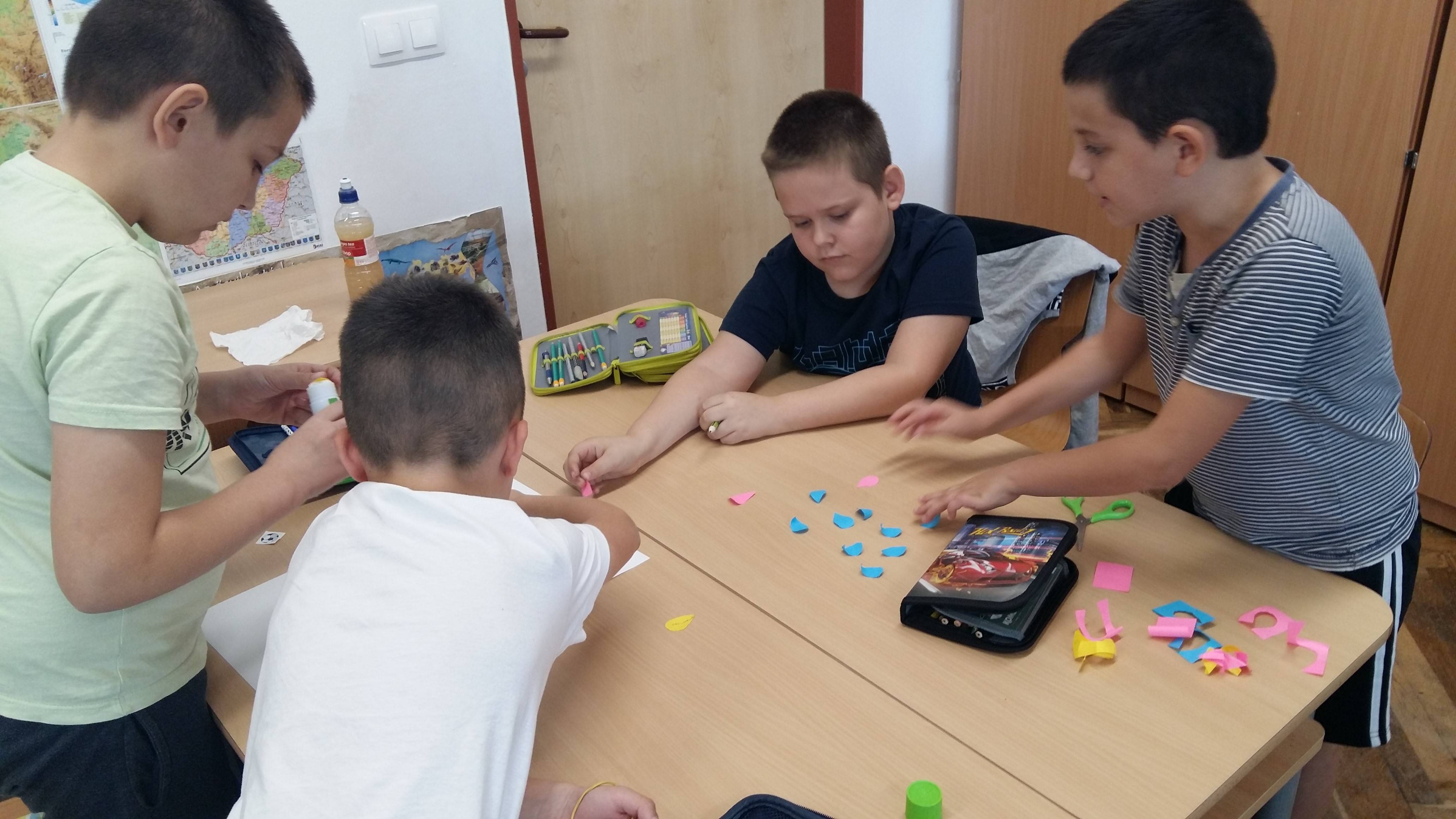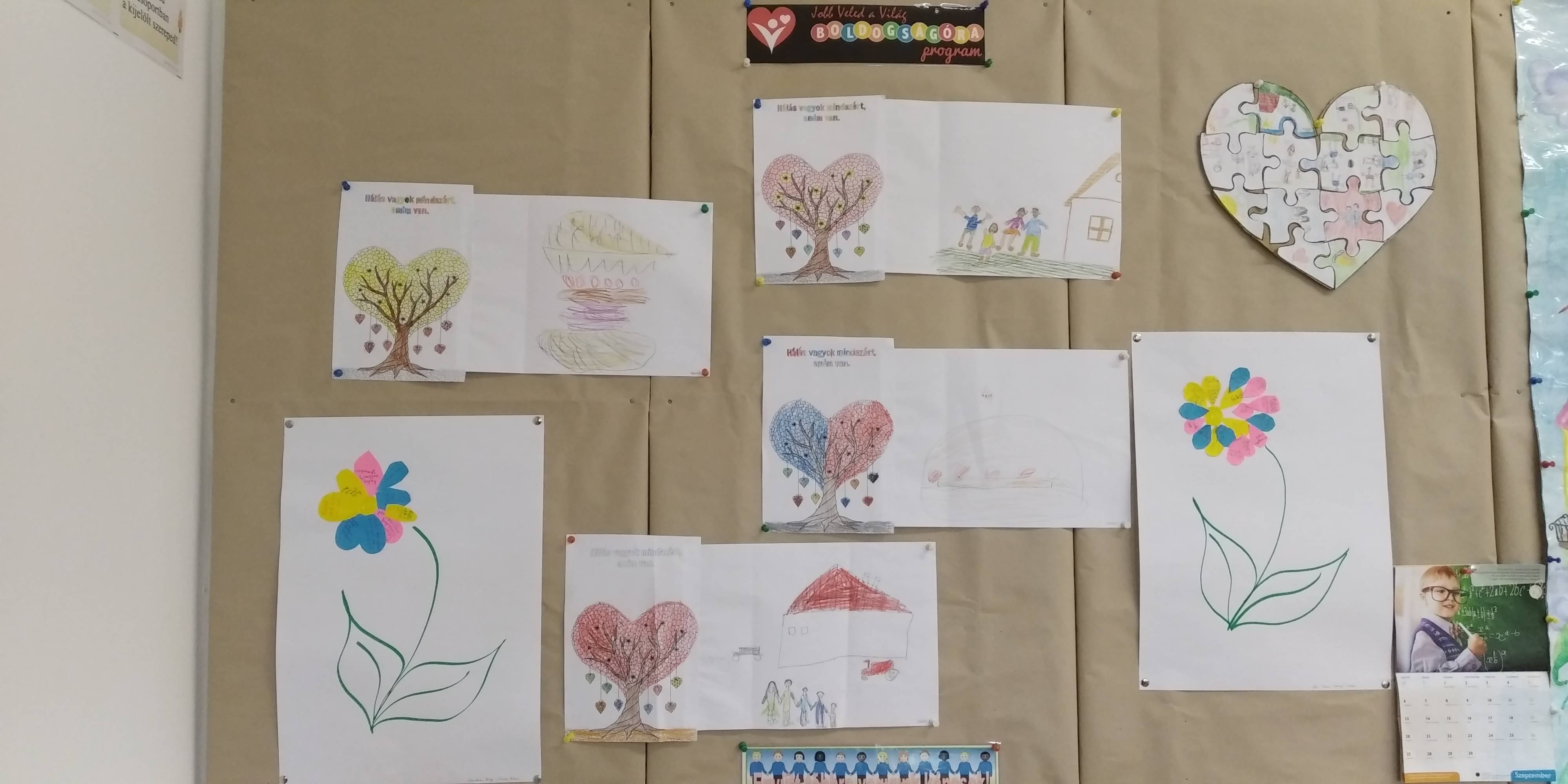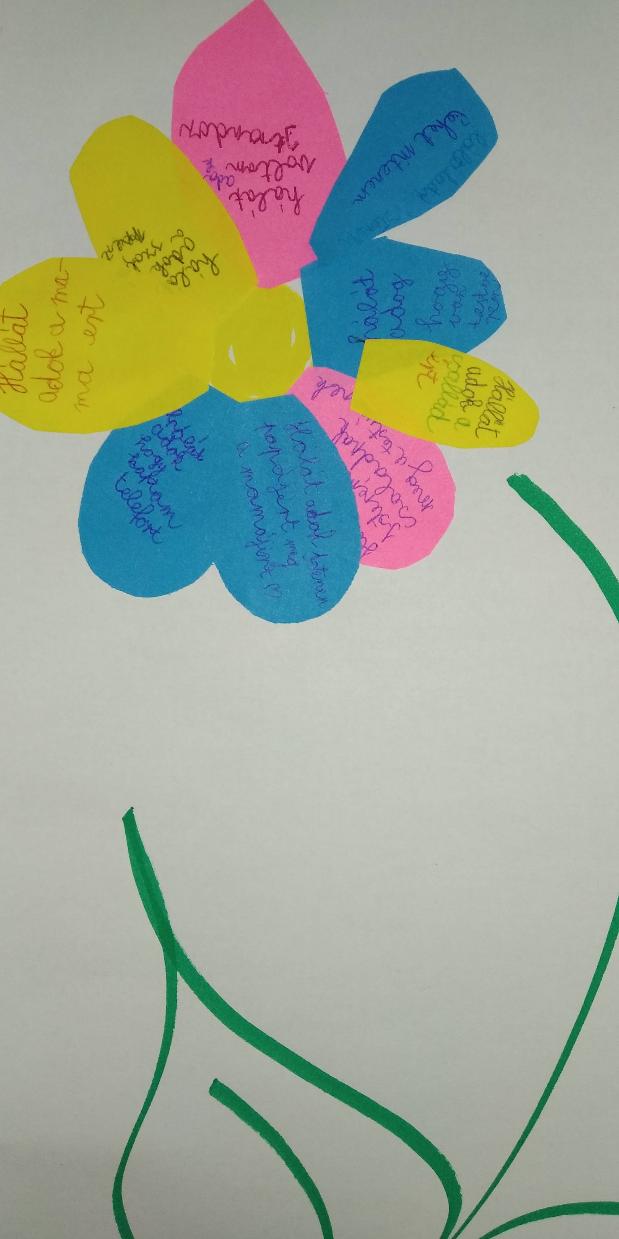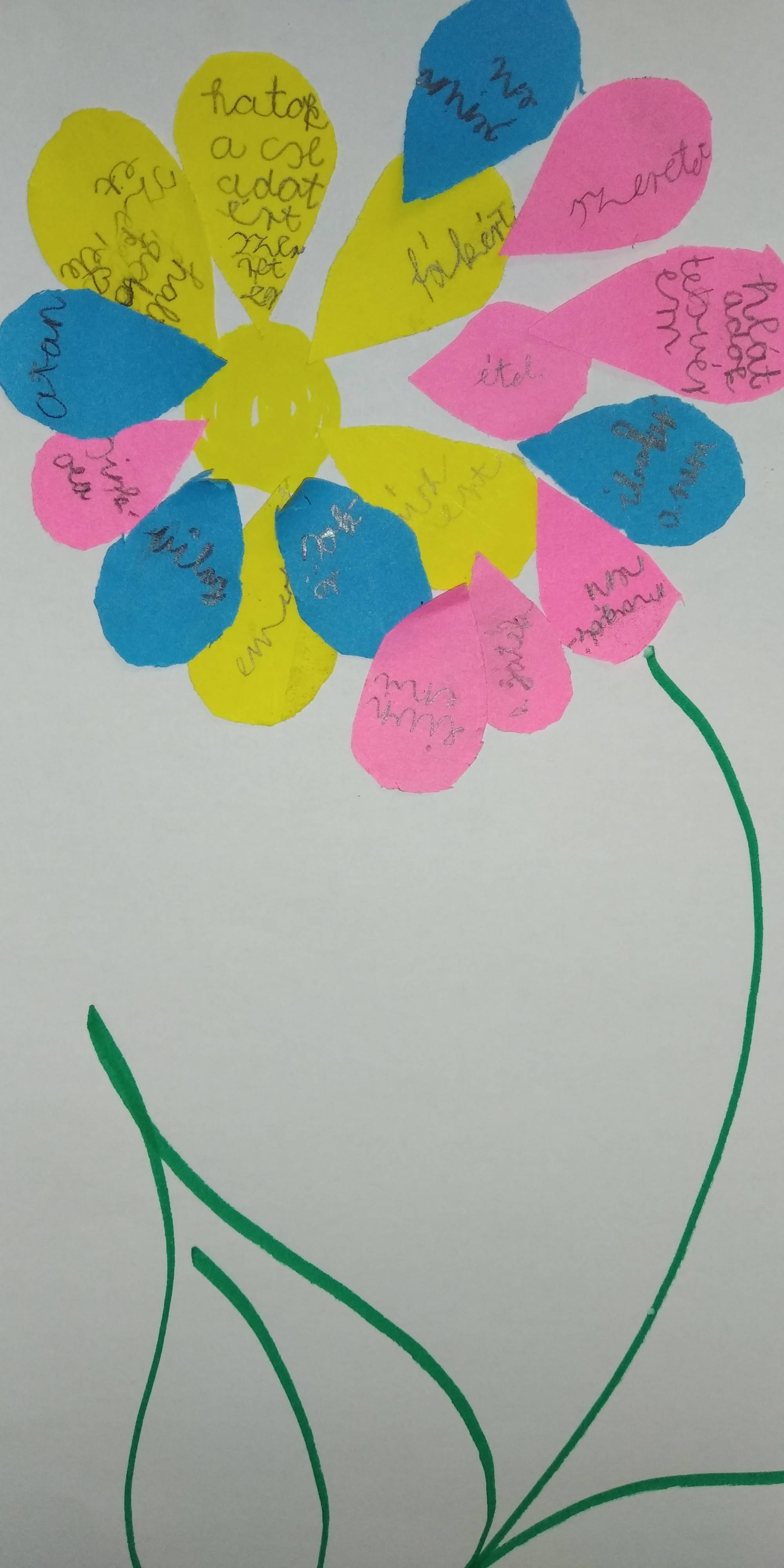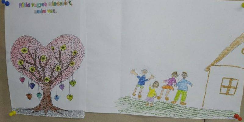 A téma bevezetéseként egy puzzle szívecske darabjaira rajzolták meg a gyerekek mindazt, ami őket boldoggá teszi, majd összeállították a boldogság-szívet. A szeptemberi téma feldolgozását a háláról való beszélgetéssel kezdtük, szinonimákat és példákat kerestünk a fogalomhoz kapcsolódóan. Ezt követően rövid relaxációval folytatódott a foglalkozás, majd mesehallgatás következett: a Holle anyó című mesével ismerkedtek meg a gyerekek. Megvitattuk, hogy a történet mely szereplői és kinek lehetnek hálásak, majd példát kerestek a gyerekek saját életükből arra, hogy ők minek kapcsán éreznek hálát. A téma feldolgozása hála-virág készítésével folytatódott: a gyerekek színes papírból szirmokat vágtak ki és ragasztottak fel, majd minden sziromra ráírták, hogy mi mindenért hálásak. A foglalkozást zenehallgatással zártuk.