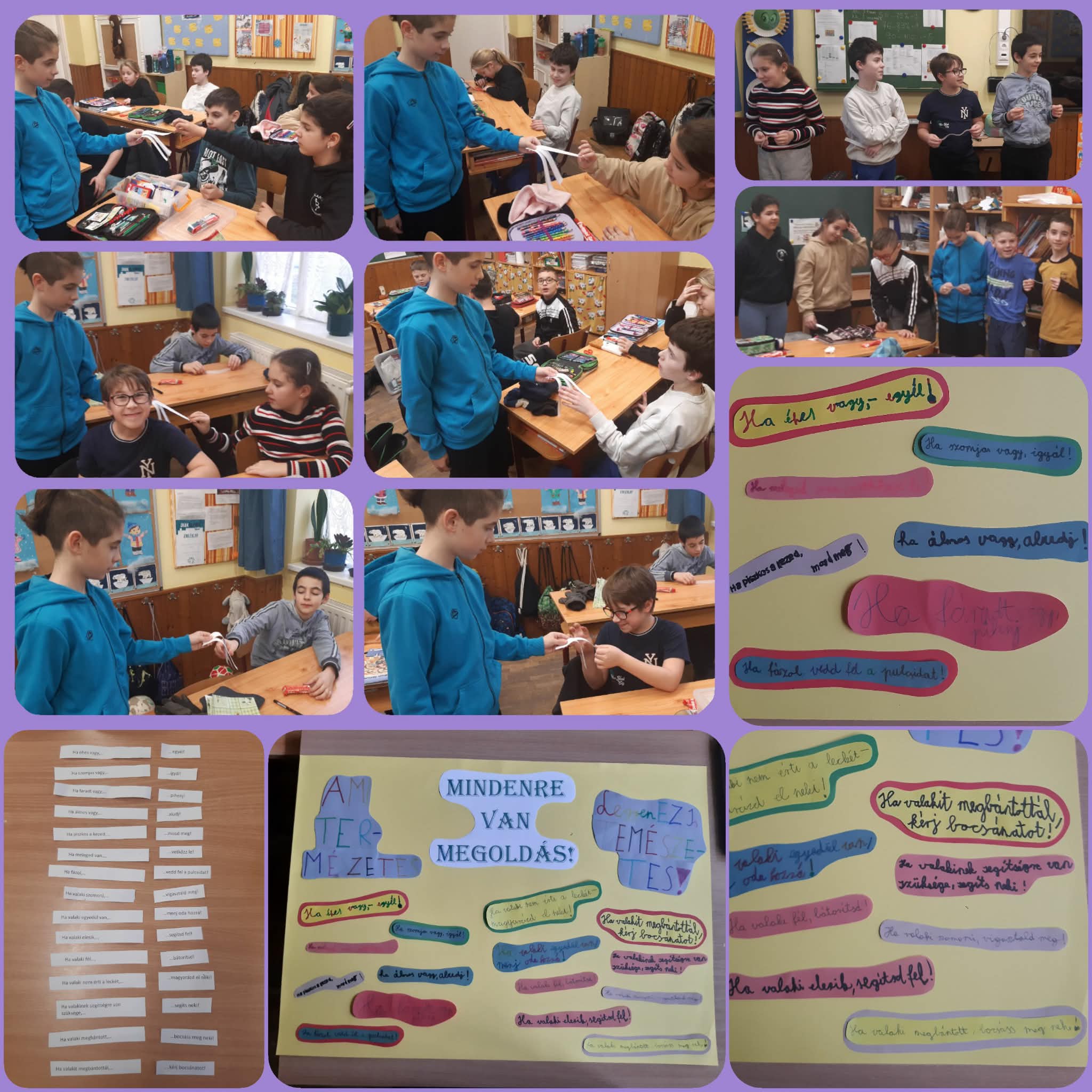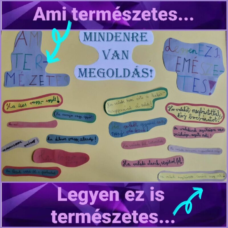 Mondatok párosítása volt az első feladatunk. A láncfeladatban mindenki húzott egy cetlit, amin mondatok befejezése és egy új mondat kezdete volt. A mondatok tartalma először természetes szükségleteinkre vonatkozott: ha éhes vagy … egyél; ha szomjas vagy … igyál; stb. Akik ezeket a mondatokat húzták, nagyon könnyen megtalálták a megoldást a problémára. A feladat azonban nehezedett, amikor lelki szükségleteinkre terelődtek a mondatok: ha valakit megbántottál …; ha valakinek segítségre van szüksége …, ha valaki fél … stb. Ezeknél a mondatoknál nehezebben jöttek a megoldások, de megbeszéltük, hogy ezekben a helyzetekben is meg kell találnunk a megoldást, gyakorolnunk kell a lelki segítségnyújtást, erősödnünk kell személyes ügyeink megoldásában, ezen helyzetekben történő megküzdésekben. Plakátot készítettünk a mondatokból: van, ami természetes (testi szükségleteink), legyen természetes lelki segítségnyújtásunk is!