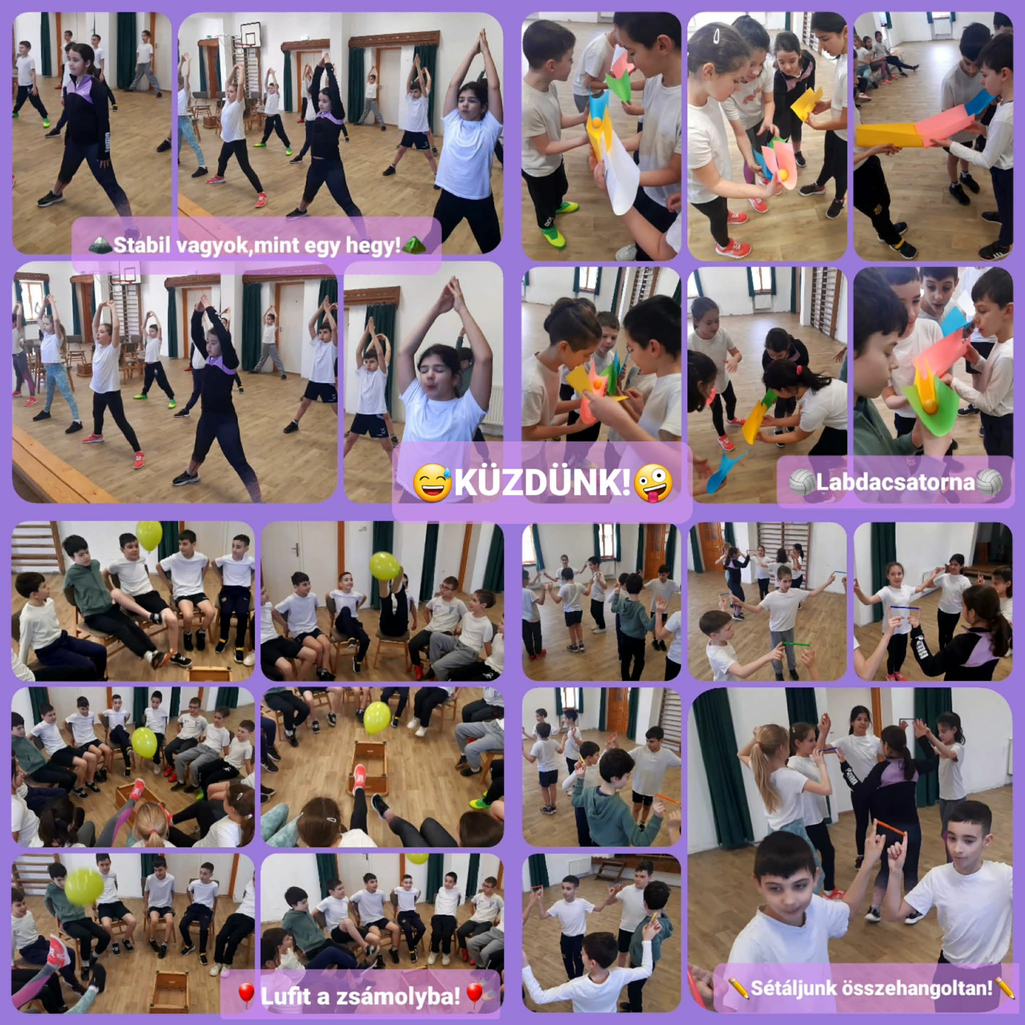 A hónapot néhány „megküzdős”-mozgásos feladattal zártuk. Testnevelés órán stabilitásunkat erősítettünk a Tenki Réka színművész hangján megszólaló utasítások alapján. A Stabil vagyok, mint egy hegy gyakorlattal testi stabilitásunk mellett lelkünk egyensúlyát is erősítettük. Ezután három gyakorlatot végeztünk, melyben a személyes és közös küzdelem okozott vidám helyzeteket. Pingponglabdát vezettünk papírcsatornában, lufit irányítottunk egy zsámolyba lábunkkal, majd ceruzákat szállítottunk a terem egyik végéből a másikba összedolgozva csapattársainkkal. Megküzdöttünk a feladatokkal, egymással, magunkkal, a pingponglabdákkal, a lufival, a tollakkal, az idővel… Ebből a feladatból is tanultunk: ha figyelünk egymásra, minden könnyebben megy. Ezzel a gondolattal visszakanyarodtunk az ehavi első feladatunkhoz: legyen természetes számunkra, hogy figyelünk egymásra, segítjük egymást, így még boldogabb lesz a közösségünk!
