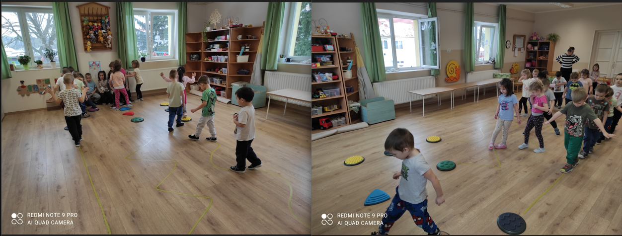 A mozgástevékenységünket is összekapcsoltuk a boldogságórával, különböző alakzatokon kellett a gyerekeknek végighaladniuk, hogy végül eljussanak a Boldogvárhoz.