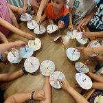 Az összes gyöngyöt felfűzték ma, elfogyott. Viszont mondtam nekik, hogy sokkal jobbat adok nekik, és kiszínezték a korongot, ami szintén a feladatlapból való. Pörgettyű készült belőle, egy ceruza volt a közepére téve. Feltettük a lépcsőre a legutolsó szimbólumot, körbeálltuk, és megnéztük, milyen ügyesek, és kitartóak voltunk, mert eddig sajnos a vírus miatt nem járhattuk végig a fokokat. Ez az első! Meg is éljeneztük. A mesét folytattam, be is fejeztük. Tettszett nekik, mert nagyon figyeltek. Természetesen a mai zene sem maradt el.