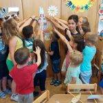 A tegnapi tánc műsor nagyon tettszett a gyerekeknek, mert ma (kedd) ezzel kezdték a napot. Felépítették a színpadot, gyakoroltak, előadást tartottak. Meghallgattuk Bella néhány dalát is. És mozogtak, táncoltak rá. A nagyoknak le kellett rajzolni saját magukat, mert készülünk a búcsúzásra, így megcsináljuk a faliújságot. Elkezdtük a gyöngyfűzést is, karkötőt, vagy nyakláncot lehet készíteni. A célbadobást a célok elérésénél használtuk, ma óriás kuglikat lehetett célba gurítani.