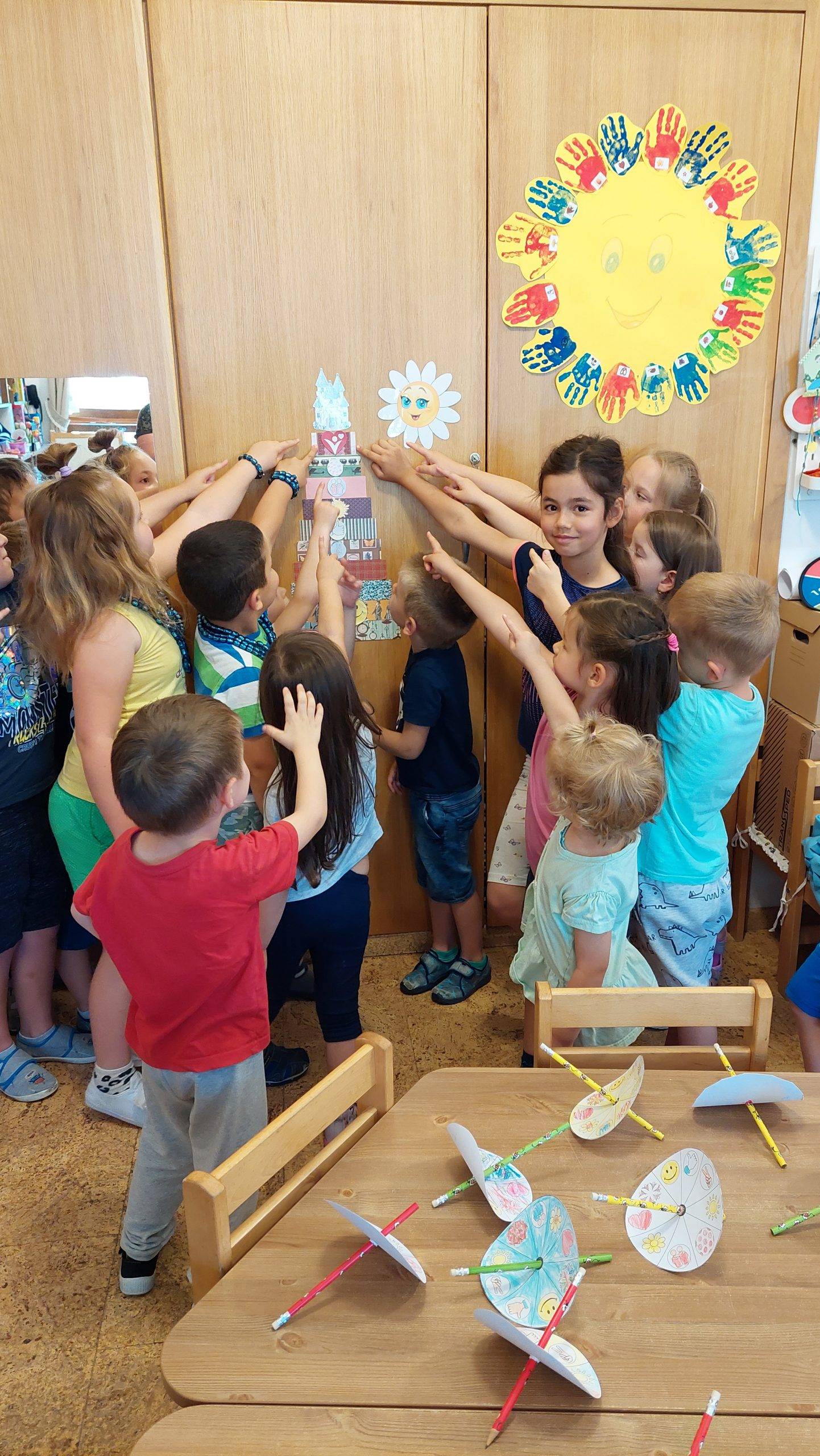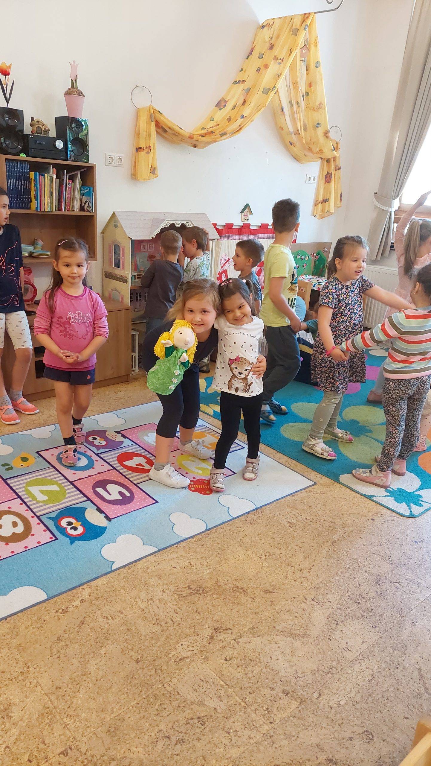 A mai, hétfői napot sok tánccal kezdtük, többet felelevenítettünk az évben hallgatottakból, és kívánságműsor is volt. Annyira tetszett a fiúknak, hogy fellépést is vállaltak, felépítették a színpadot, és modern tánc csoportot alakítottak. Ma le kellett rajzolniuk a búcsúzkodó gyerekeknek a saját arcképüket, mert az ovigalériára minden csoport pillangót készít, amire felragasztjuk „őket”. A pakolás után kivettük a kincses dobozából Dórát, aminek nagyon örültek. Dórával megismételtük a lépcsőnket használva, hogy milyen feladatokat, lépcsőfokokat jártunk be, oldottunk meg. Mindenről elmondtuk, hogy mit tanultunk róla, mi, mit jelent. A hálával kapcsolatban elmondtam, hogy az az egyik legfontosabb az életben, mindig, mindenért legyenek hálásak. Be kellett csukni a szemüket, és elmondani, hogy akkor éppen miért hálásak. Beszélgettünk a gyereknapi élményeikről, arról, mi az a fenntartható boldogság, hogy megértsék a lényegét.
