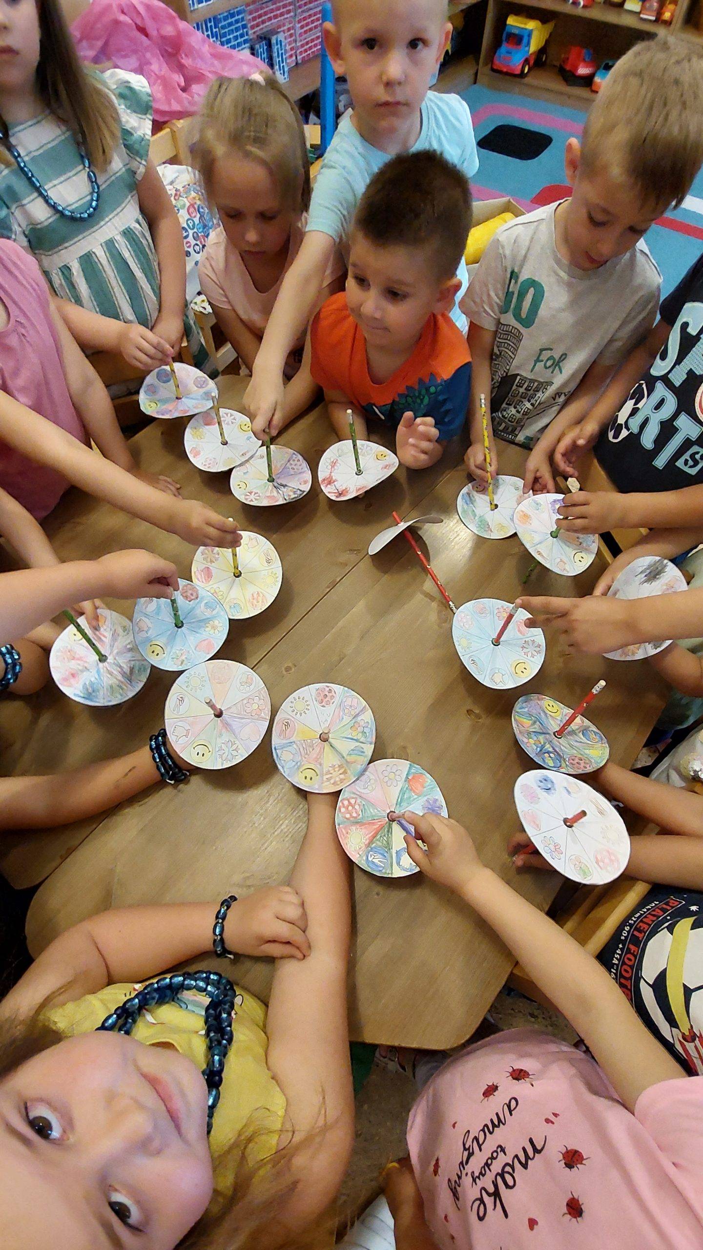 Az összes gyöngyöt felfűzték ma, elfogyott. Viszont mondtam nekik, hogy sokkal jobbat adok nekik, és kiszínezték a korongot, ami szintén a feladatlapból való. Pörgettyű készült belőle, egy ceruza volt a közepére téve. Feltettük a lépcsőre a legutolsó szimbólumot, körbeálltuk, és megnéztük, milyen ügyesek, és kitartóak voltunk, mert eddig sajnos a vírus miatt nem járhattuk végig a fokokat. Ez az első! Meg is éljeneztük. A mesét folytattam, be is fejeztük. Tettszett nekik, mert nagyon figyeltek. Természetesen a mai zene sem maradt el.