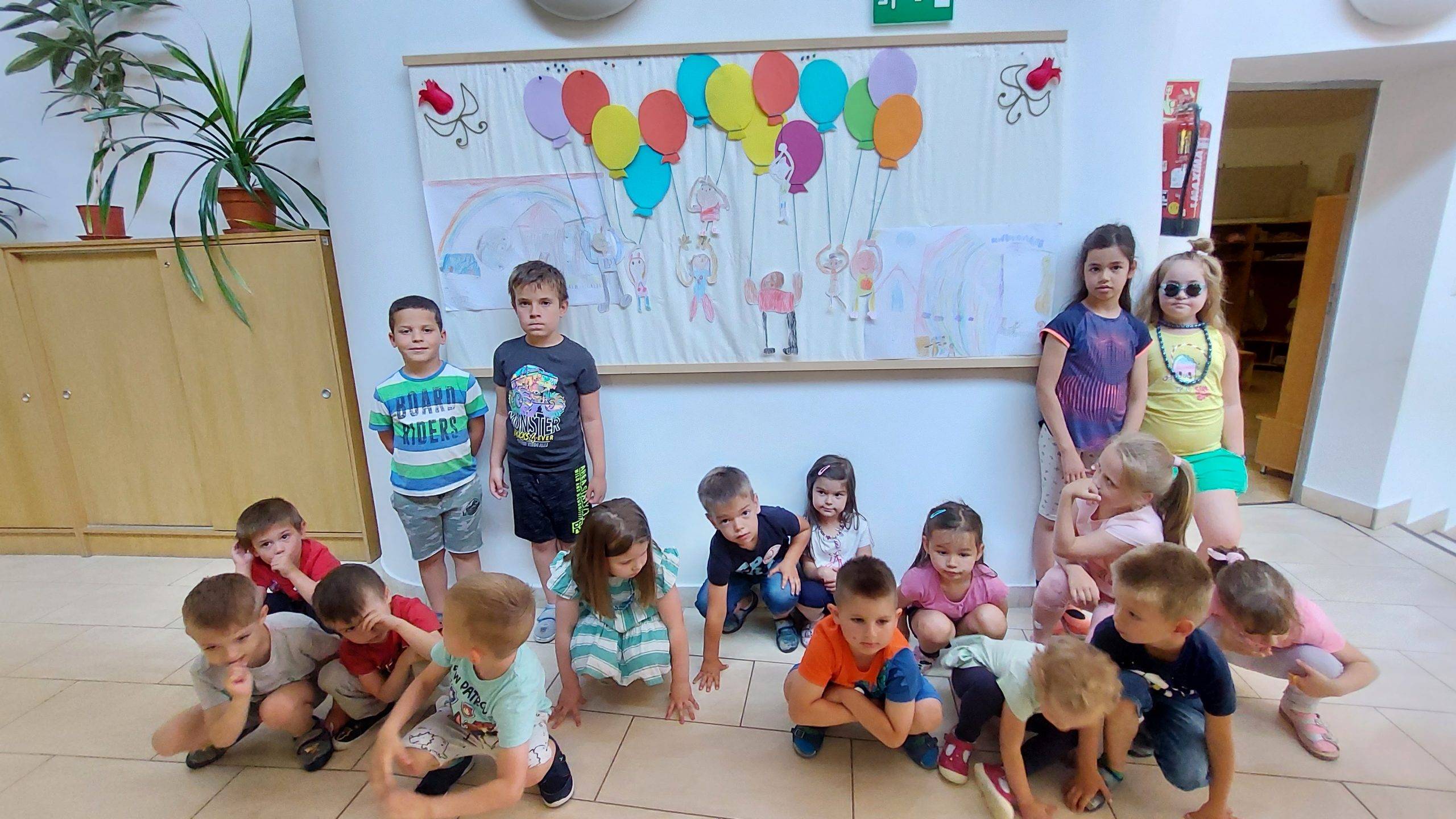 A tegnapi tánc műsor nagyon tettszett a gyerekeknek, mert ma (kedd) ezzel kezdték a napot. Felépítették a színpadot, gyakoroltak, előadást tartottak. Meghallgattuk Bella néhány dalát is. És mozogtak, táncoltak rá. A nagyoknak le kellett rajzolni saját magukat, mert készülünk a búcsúzásra, így megcsináljuk a faliújságot. Elkezdtük a gyöngyfűzést is, karkötőt, vagy nyakláncot lehet készíteni. A célbadobást a célok elérésénél használtuk, ma óriás kuglikat lehetett célba gurítani.