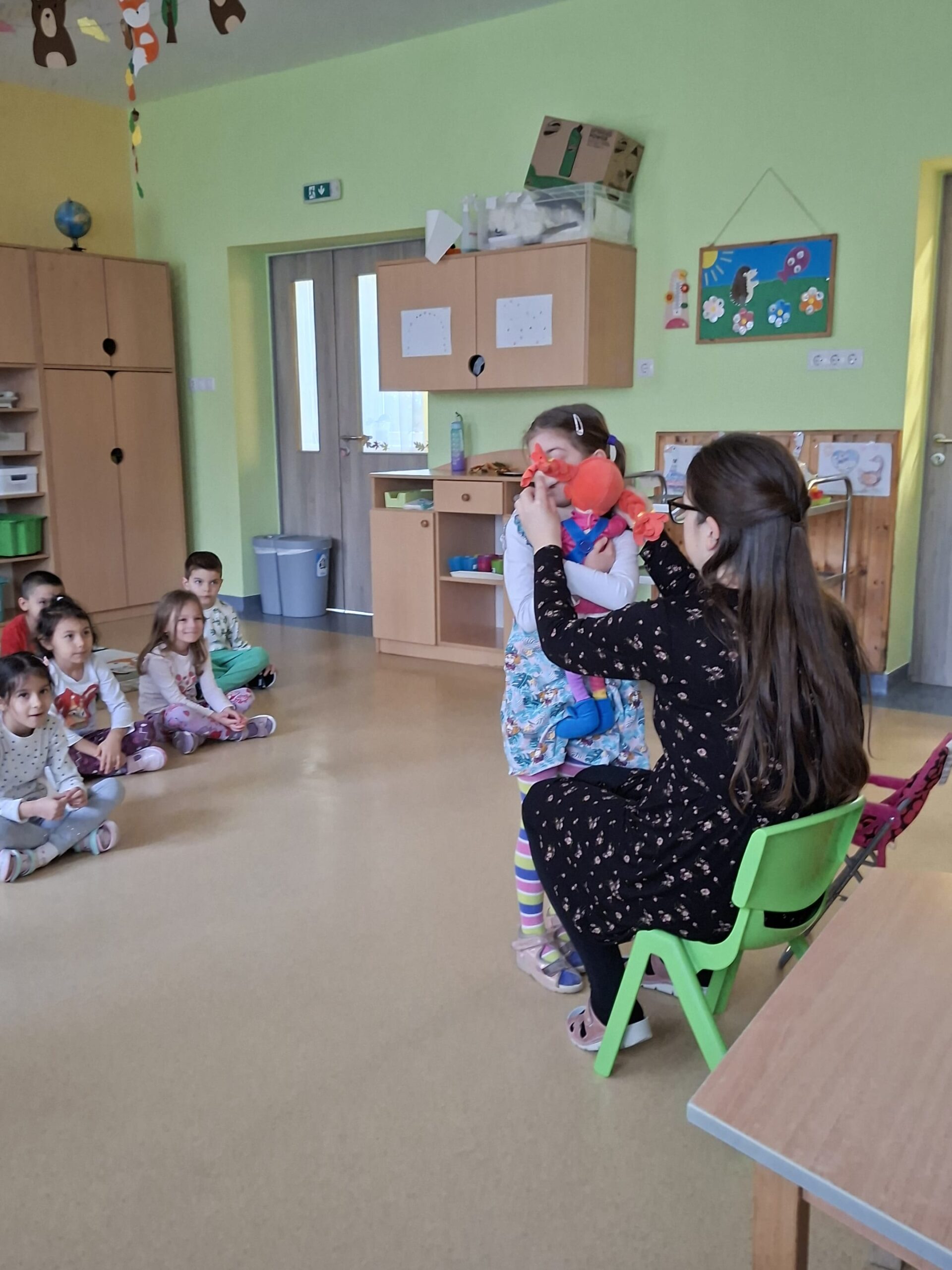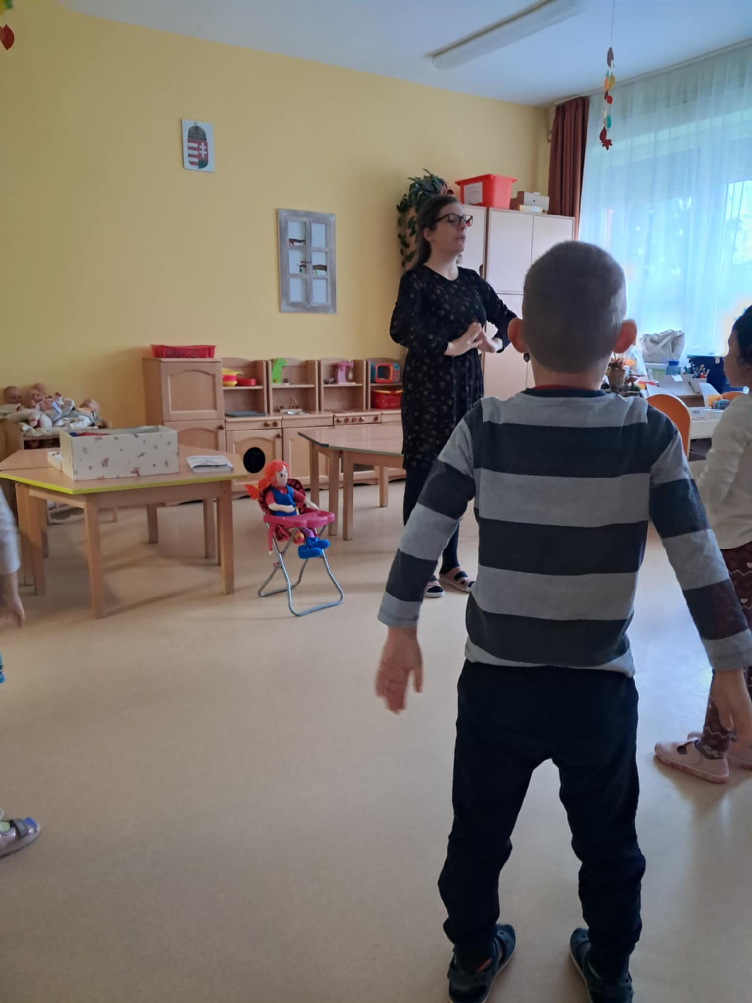 Dórával érkeztem a csoportba, a gyerekek már várták őt. (A csoport, amelyben a boldogságórás foglalkozásokat tartom nem az „enyém”. Nem én vagyok az óvónénijük, de a folyosón, ha találkozunk, sűrűn megkérdezik, hogy mikor jön hozzánk megint Dóra?) Dóra tartotta ma a foglalkozást, ő hívta a gyerekeket meditálni, és minden cselekvésre ő kérte őket.