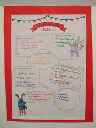 Céljaink a 2022-es évre címmel otthoni feladatvégzésre motiváltam tanulóimat. Egy a 4-es lapra különböző szempontok szerint kellett egyéni céljaikat, vágyaikat leírniuk, esetleg lerajzolniuk. Ezután a következő boldogságórán egyenként bemutatták társaiknak a saját vállalásaikat. A bemutatást egy közös munka követett. Megfogalmaztuk és felírtuk a közös, és egyben vállalható céljainkat. Megbeszéltük, hogy minden boldogságórán egy pár perc erejéig visszatérünk majd arra a fontos kérdésre, vajon ki hol tart a megfogalmazott céljainak megvalósításában. A hónap során dramatizáltunk még mesét, szituációs gyakorlatok során vitattuk meg a kitűzött célokat, énekeltük a hónap dalát, meditálva gondoltuk át a célhoz vezető útjainkat.