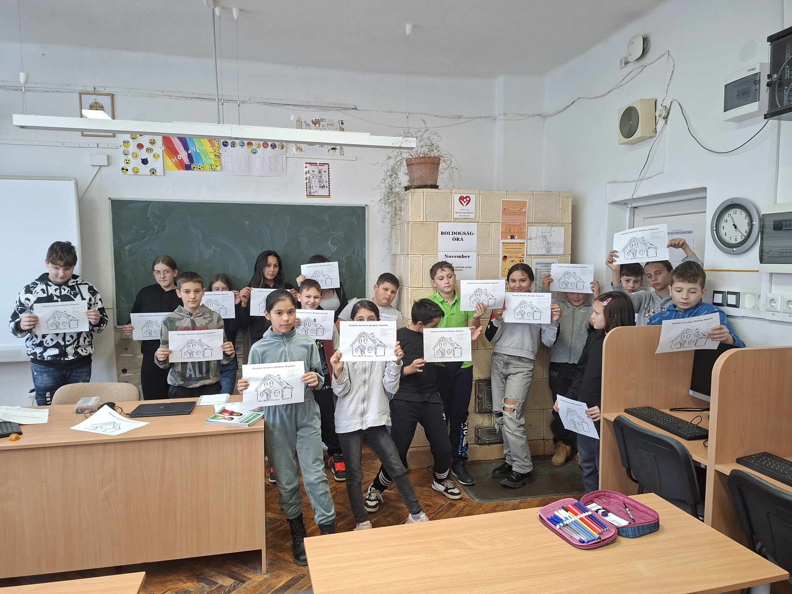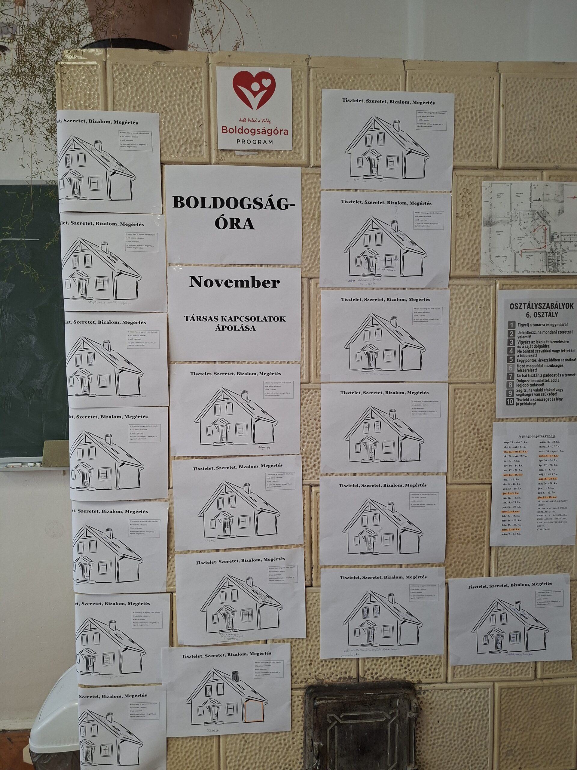 A novemberi téma a Társas kapcsolatok ápolása volt. A Boldogságóra Munkafüzetből két feladatot választottunk. Az első feladatban minden tanuló megkapta a saját házát, amelyben el kellett helyezniük a számukra fontos személyeket négy kérdés alapján. A ház alapja a tiszteletet, az ablaka a bizalmat, a tető a szeretetet, az ajtó pedig a megértést és megismerést szimbolizálta. Második feladatként pedig az osztályértékelő lapot választottuk a munkafüzetből. Az osztály életében most jobban megjelentek a kamaszkori konfliktusok, így ezt a szociometriára hasonlító feladatot hosszabb távon is hasznosan tudjuk majd használni az osztályközösségben.