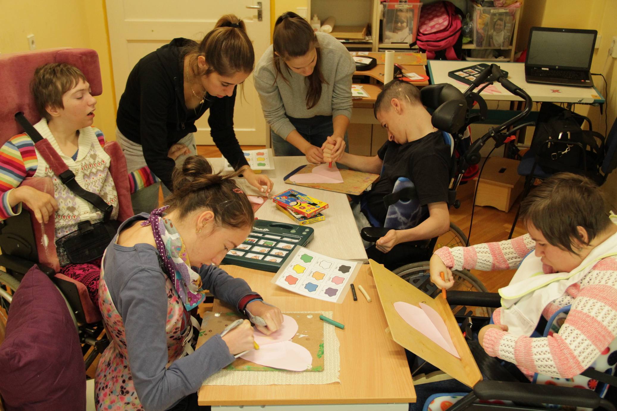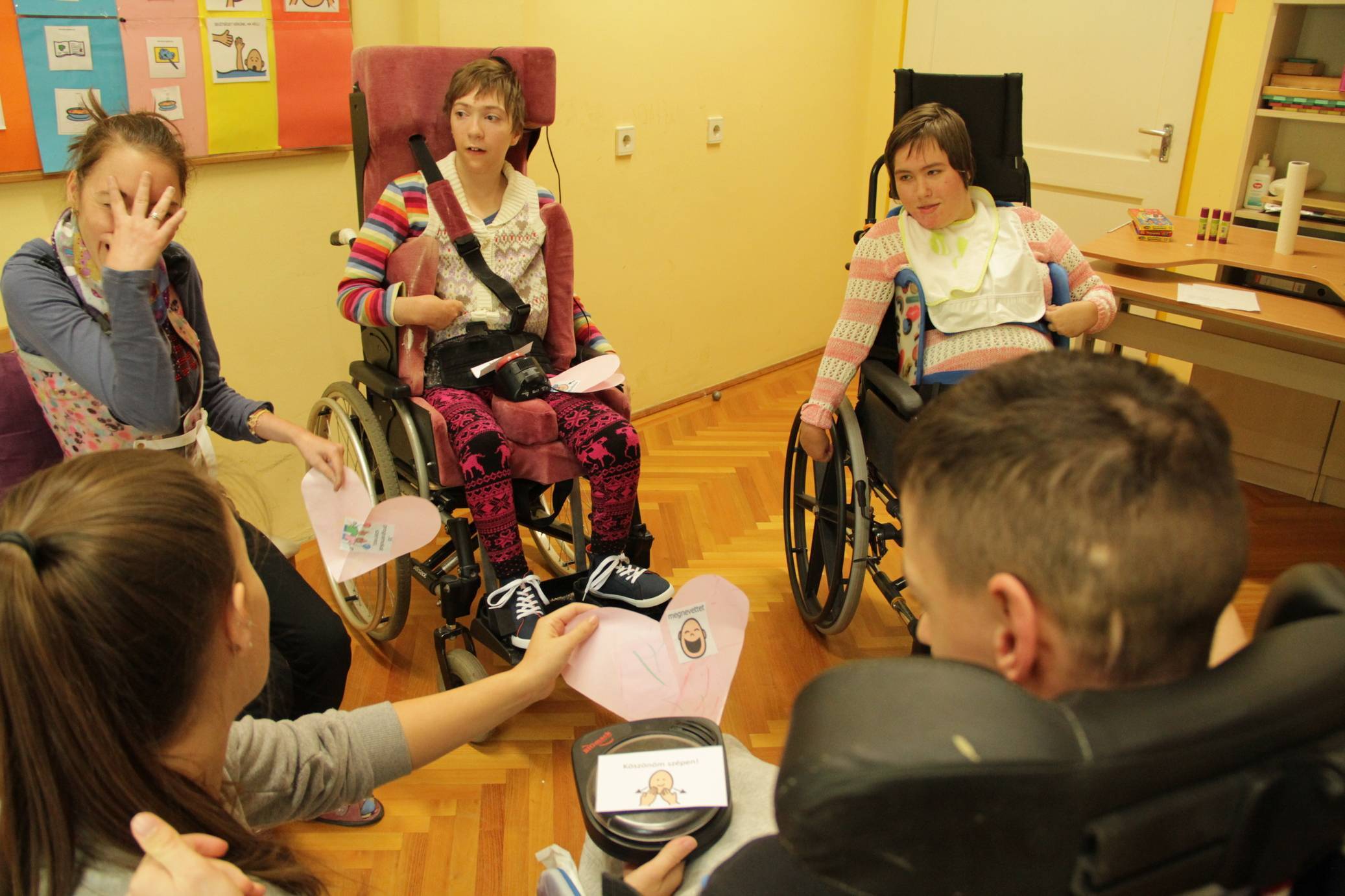 Az első Boldogság órát szeptember 27-én tartottuk. A témák feldolgozására egy teljes napot szántunk. Az órákat a zöld csoport 6 súlyosan, halmozottan sérült, nem beszélő növendékeivel valósítottuk meg.