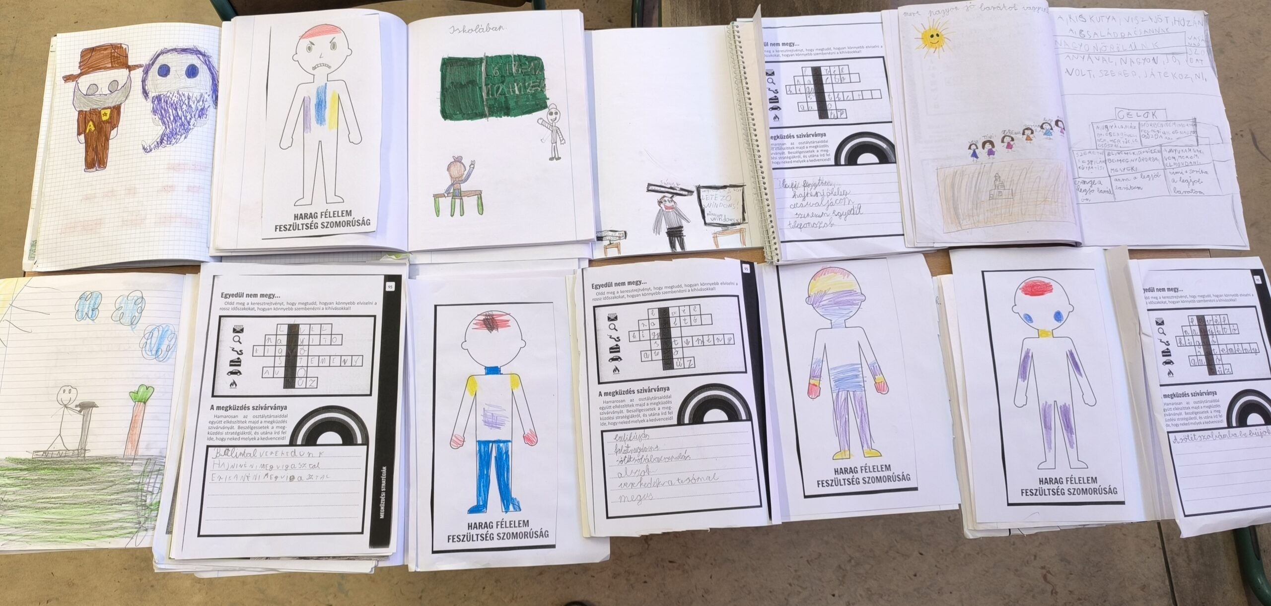– Felsorolás alapján, különböző színnel is jelöljük. Ha harag akkor pirossal, ha a félelem sárgával, ha feszültség lilával, ha szomorúság kékkel. ⇒ Fáj a fejem, Izzad a tenyerem, Fáj a gyomrom, Remeg a lábam, Piros az arcom, Gyorsan ver a szívem, Melegem van, Fáj a hasam, Belázasodok, Hányingerem lesz, Sírni kezdek, Ökölbe szorul a kezem, Gyorsabban veszem a levegőt, Kiszárad a szám.