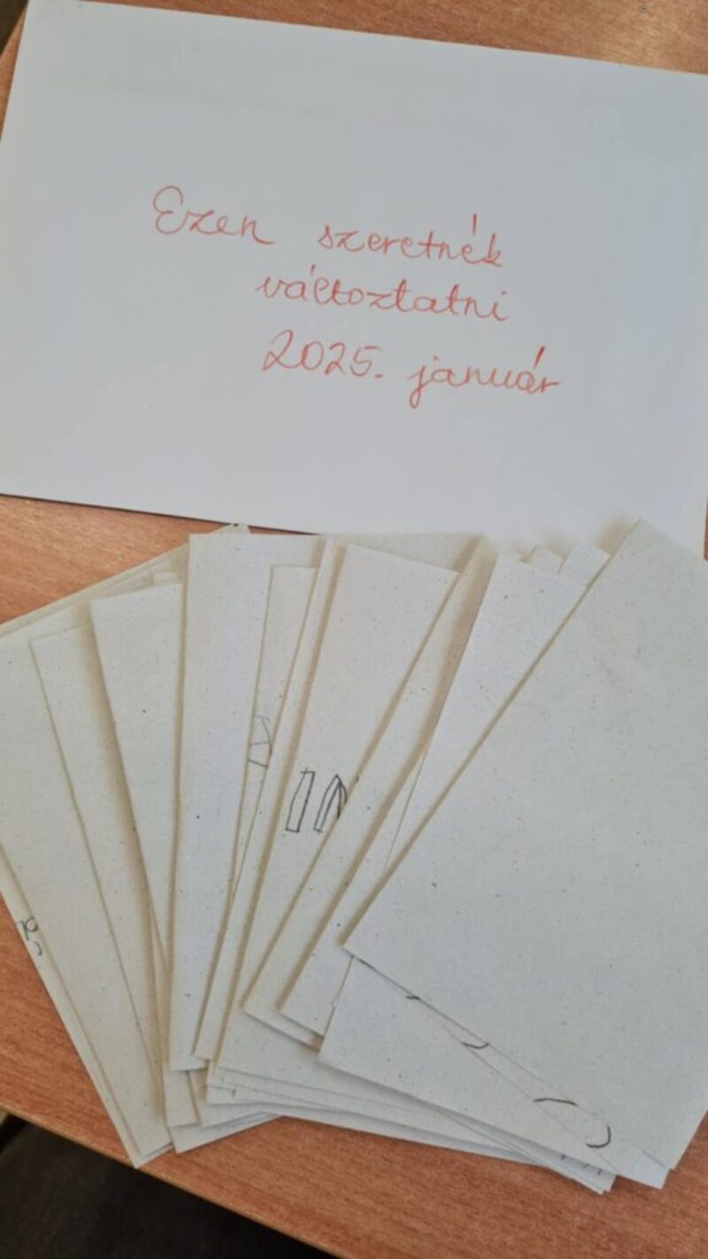 A foglalkozást a 2024. januárjában írt céljaik kiosztásával kezdtük. Felolvasták, elmondták, hogy mit sikerült teljesíteni/elérni, mi az amit nem. A beszélgetés után a 2025-ös év célját írták ismét lapra, amit ez alkalommal is borítékba zártunk, hogy 1 év múlva megnézzük, mit sikerült teljesíteni/elérni. Ami fontos változás az előző évi célhoz képest, hogy most azt kellett leírni, mit szeretnének önmagukon változtatni. Mi van olyan kevésbé jó/rossz szokás, tulajdonság, hozzáállás… stb., amin úgy gondolják változtatniuk kellene.
